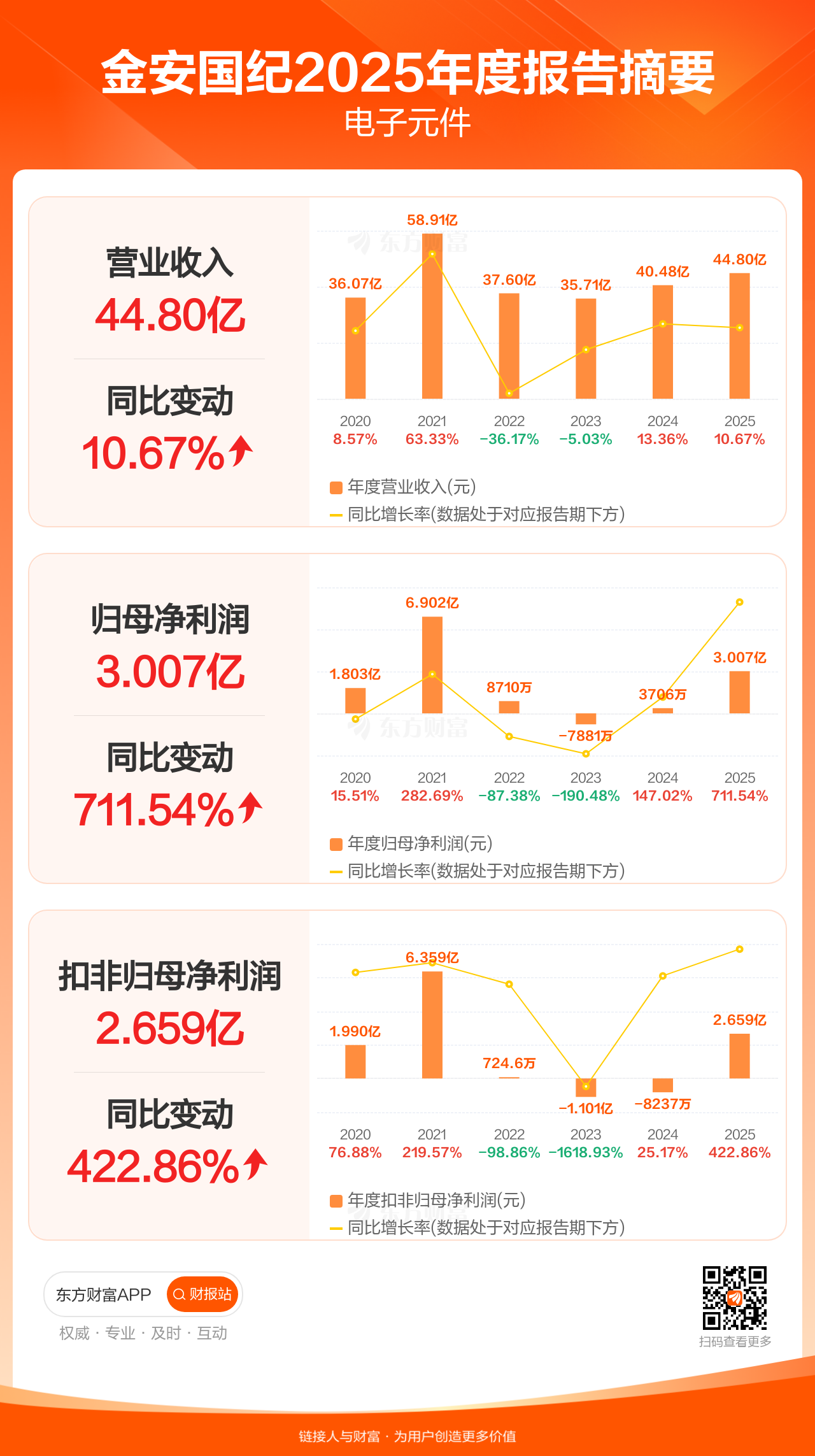 金安国纪4月29日发布2025年年报显示,公司全年实现营业收入44.80亿元,同比增长10.67%;归母净利润3.01亿元,同比增长711.54%;扣非归母净利润2.66亿元,同比增长422.86%。