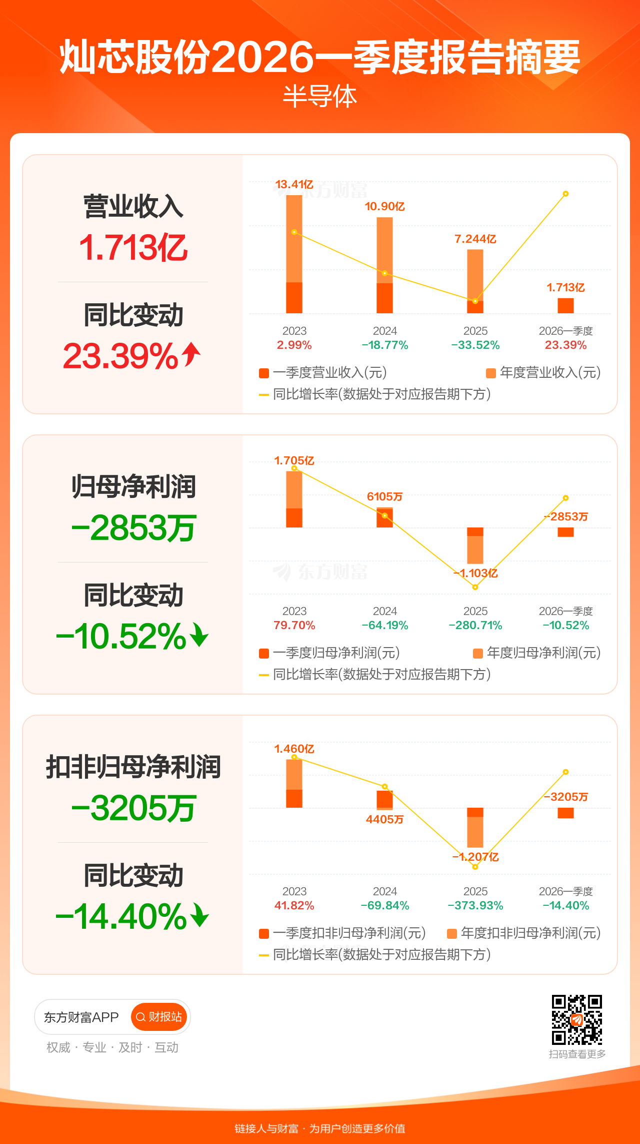 灿芯股份4月29日发布2026年一季报显示,公司一季度实现营业收入1.71亿元,同比增长23.39%;归母净利润-2852.94万元;扣非归母净利润-3205.44万元。