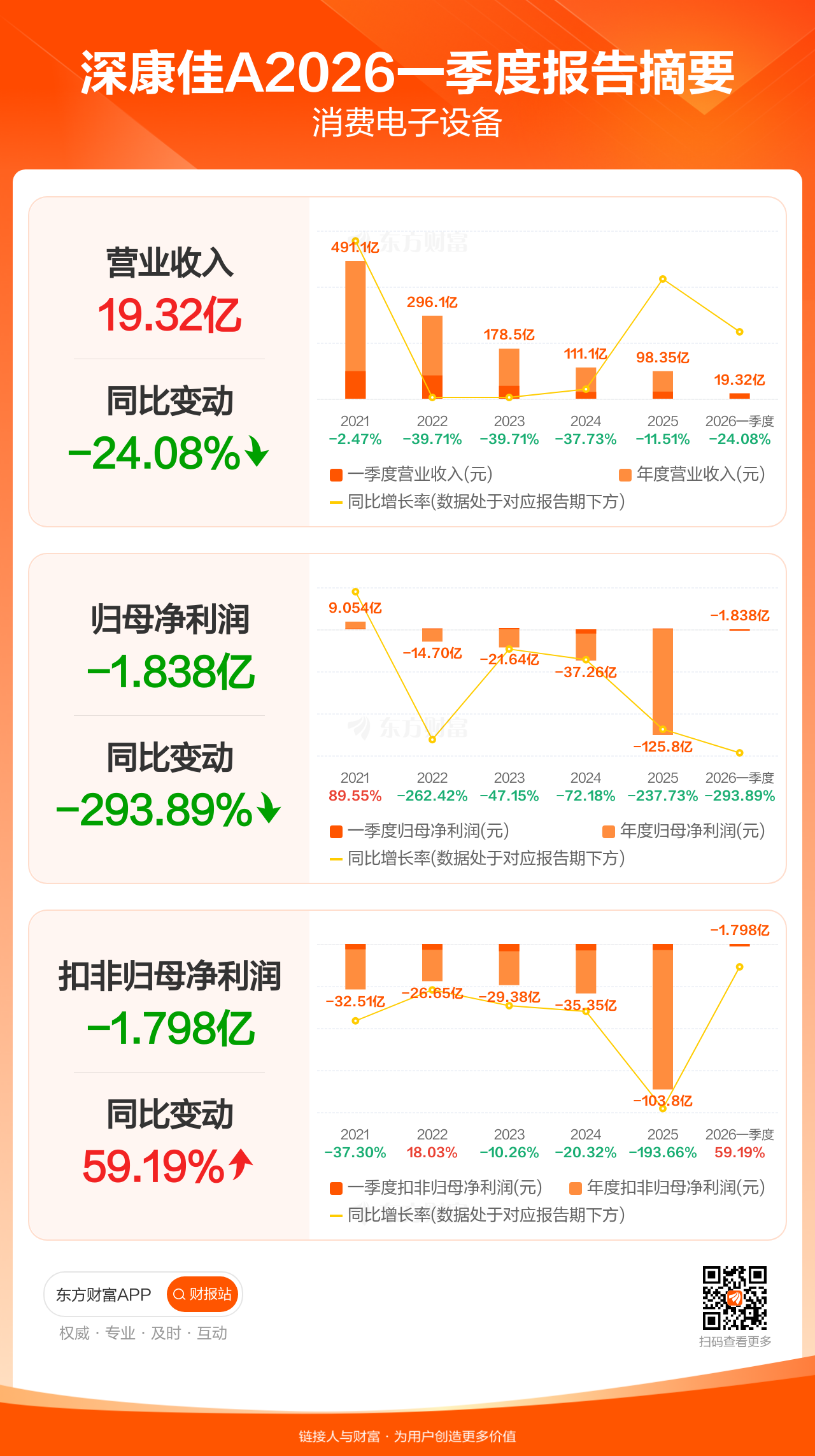 深康佳A4月29日发布2026年一季报显示,公司一季度实现营业收入19.32亿元,同比下滑24.08%;归母净利润-1.84亿元;扣非归母净利润-1.80亿元。