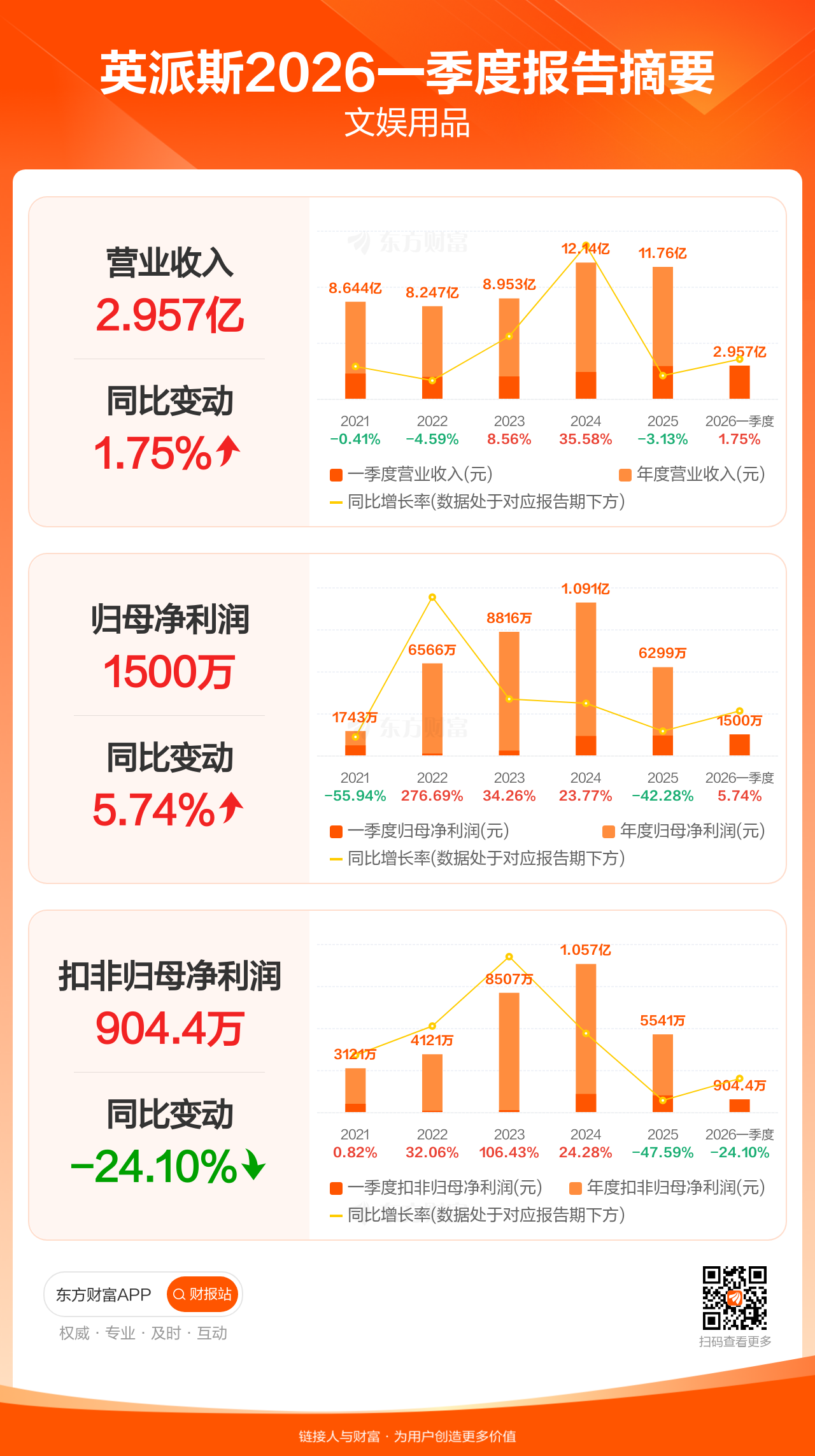 英派斯4月29日发布2026年一季报显示,公司一季度实现营业收入2.96亿元,同比增长1.75%;归母净利润1500.41万元,同比增长5.74%;扣非归母净利润904.39万元,同比下滑24.10%。