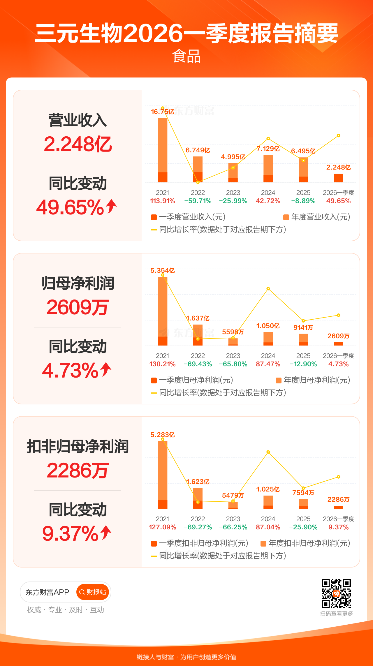 图解财报:三元生物一季度归母净利润2609.14万元,同比增长4.73%