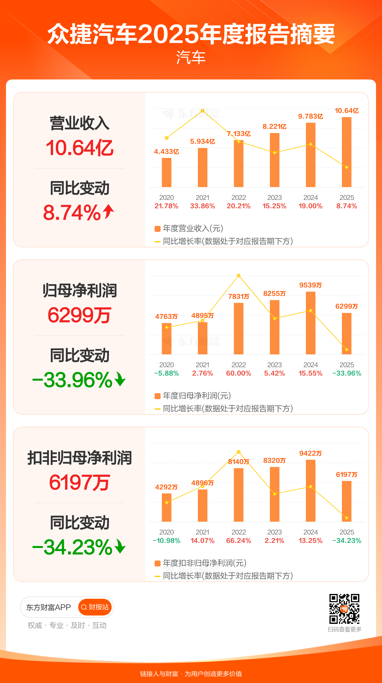 众捷汽车4月29日发布2025年年报显示,公司全年实现营业收入10.64亿元,同比增长8.74%;归母净利润6298.92万元,同比下滑33.96%;扣非归母净利润6197.07万元,同比下滑34.23%。