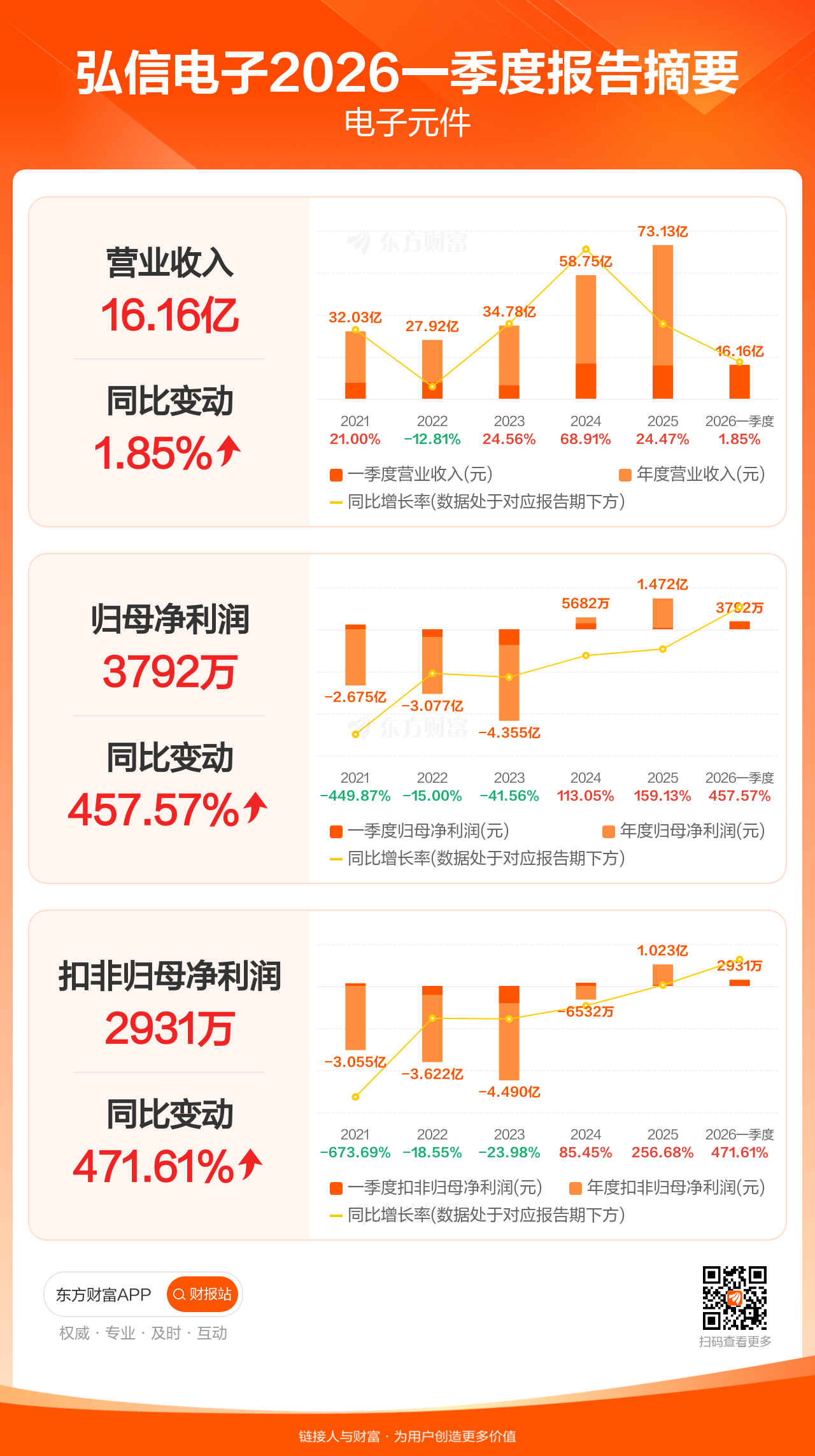 弘信电子4月29日发布2026年一季报显示,公司一季度实现营业收入16.16亿元,同比增长1.85%;归母净利润3791.88万元,同比增长457.57%;扣非归母净利润2930.76万元,同比增长471.61%。