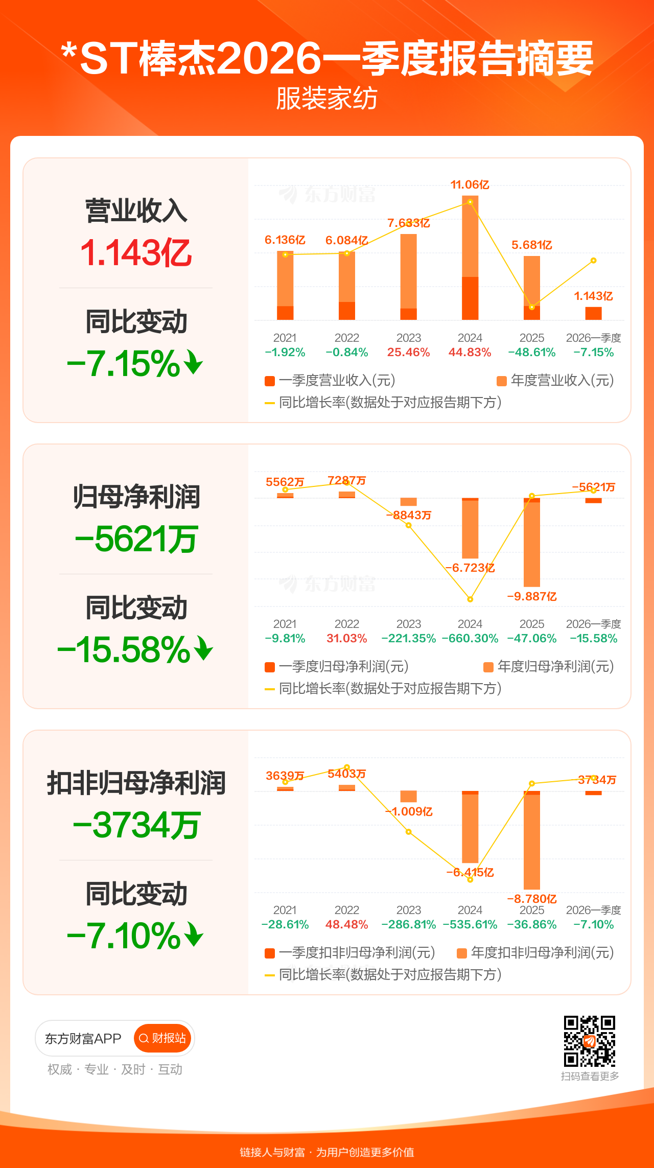 *ST棒杰4月29日发布2026年一季报显示,公司一季度实现营业收入1.14亿元,同比下滑7.15%;归母净利润-5620.54万元;扣非归母净利润-3734.43万元。