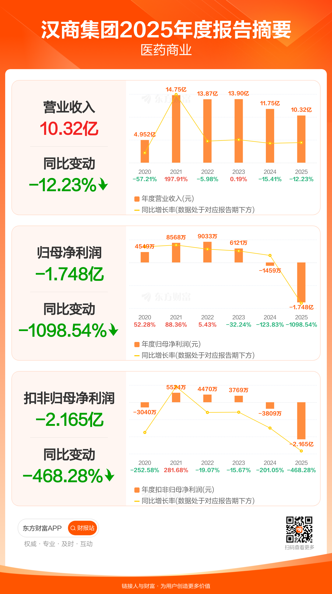 汉商集团4月29日发布2025年年报显示,公司全年实现营业收入10.32亿元,同比下滑12.23%;归母净利润-1.75亿元;扣非归母净利润-2.16亿元。