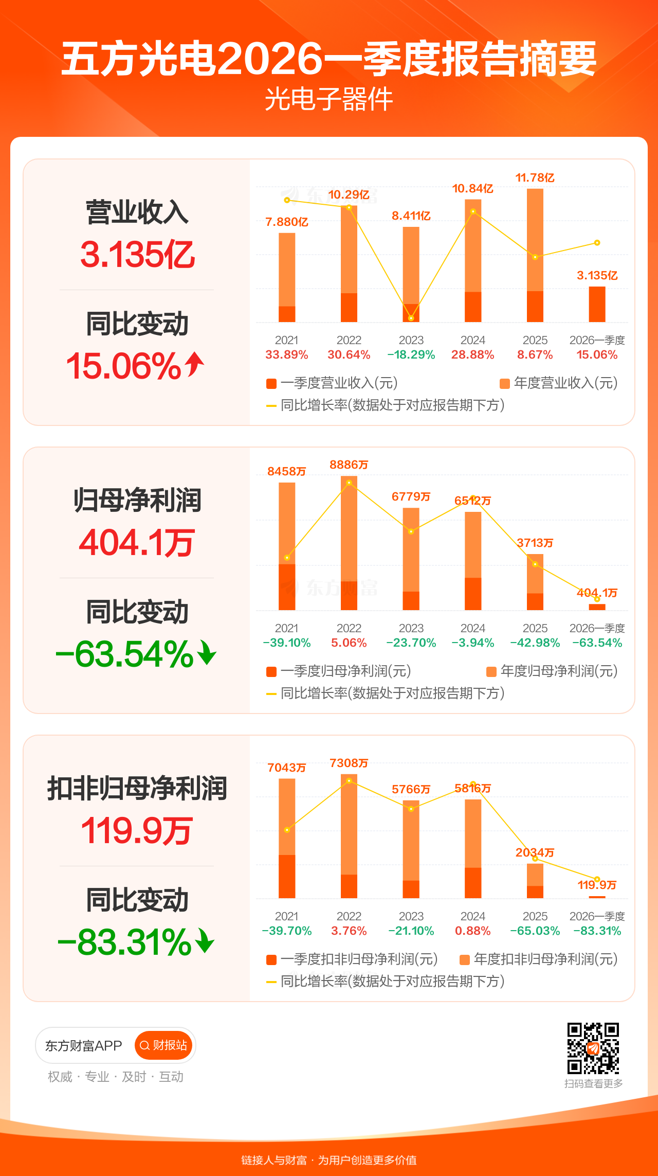 五方光电4月29日发布2026年一季报显示,公司一季度实现营业收入3.13亿元,同比增长15.06%;归母净利润404.11万元,同比下滑63.54%;扣非归母净利润119.91万元,同比下滑83.31%。