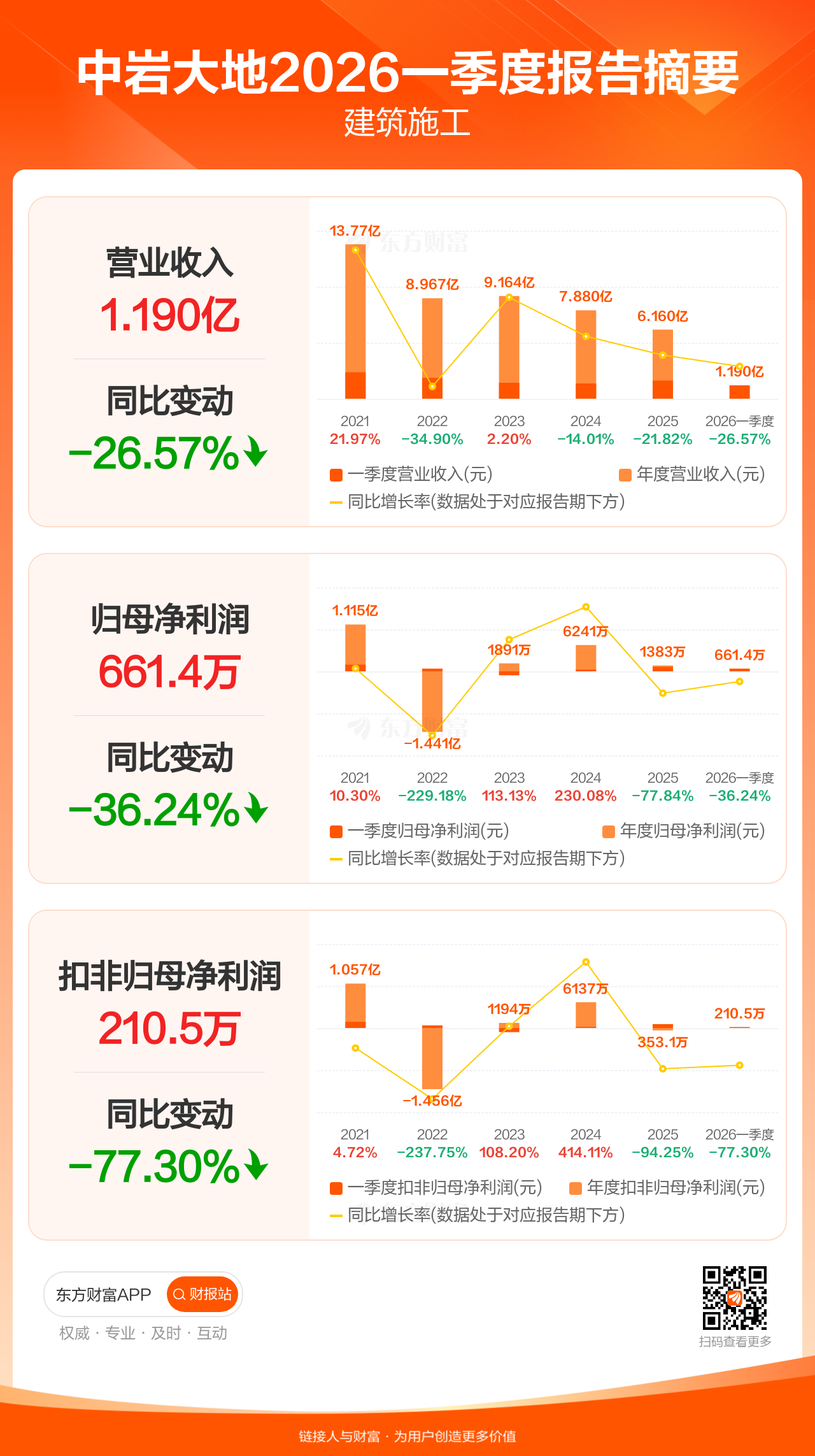 中岩大地4月29日发布2026年一季报显示,公司一季度实现营业收入1.19亿元,同比下滑26.57%;归母净利润661.45万元,同比下滑36.24%;扣非归母净利润210.50万元,同比下滑77.30%。
