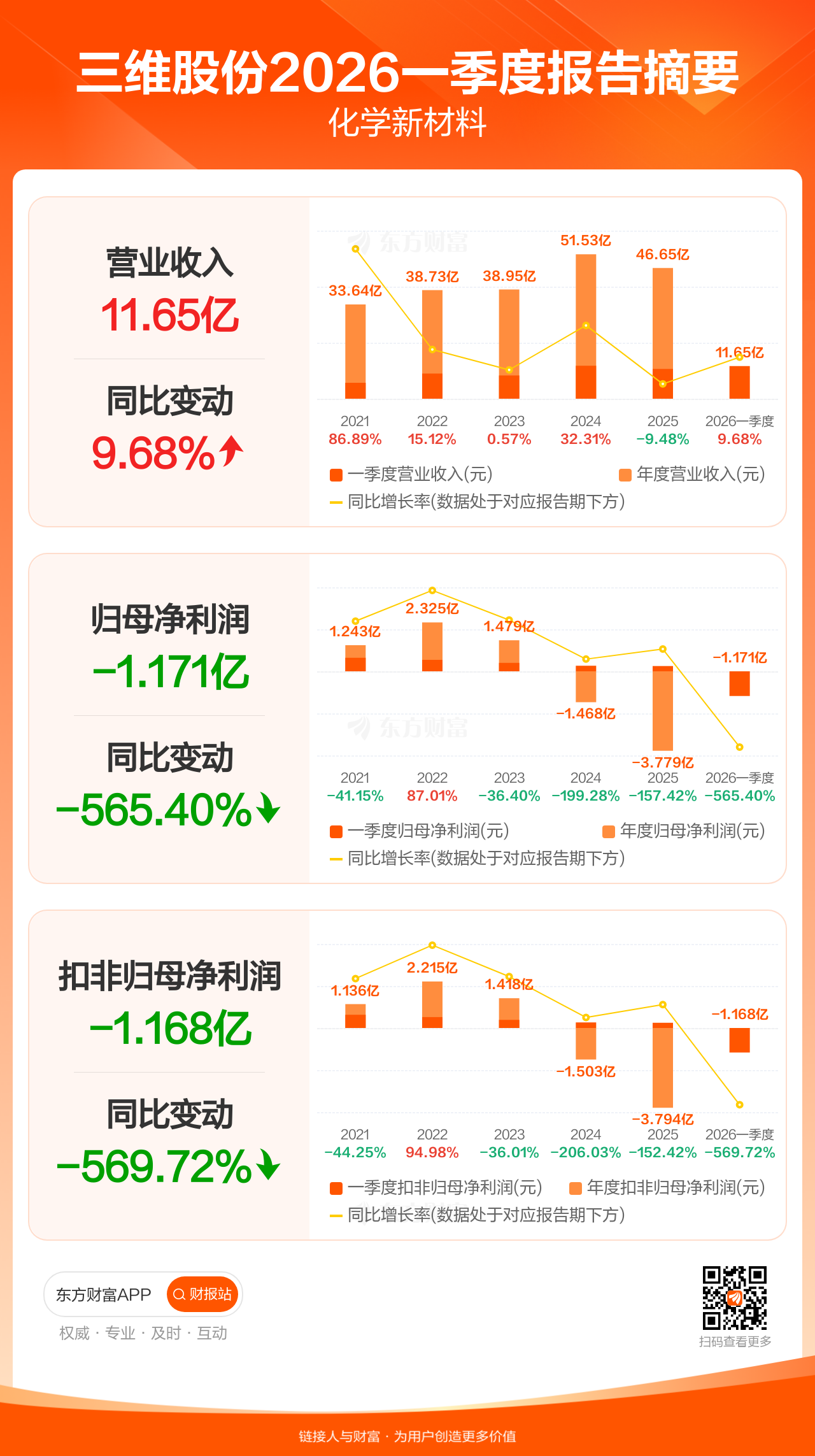 三维股份4月29日发布2026年一季报显示,公司一季度实现营业收入11.65亿元,同比增长9.68%;归母净利润-1.17亿元;扣非归母净利润-1.17亿元。