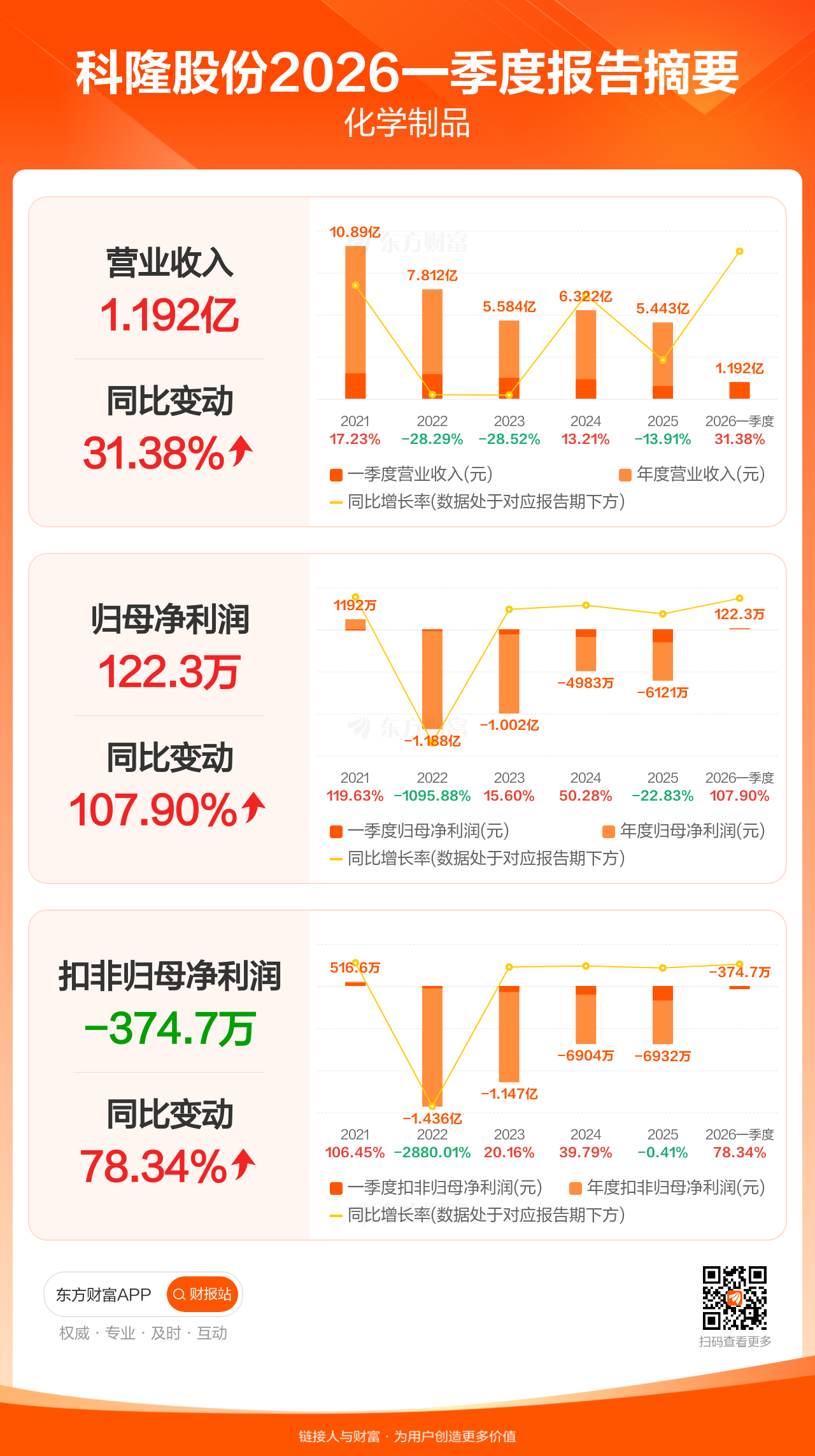 科隆股份4月29日发布2026年一季报显示,公司一季度实现营业收入1.19亿元,同比增长31.38%;归母净利润122.28万元,同比增长107.90%;扣非归母净利润-374.68万元。