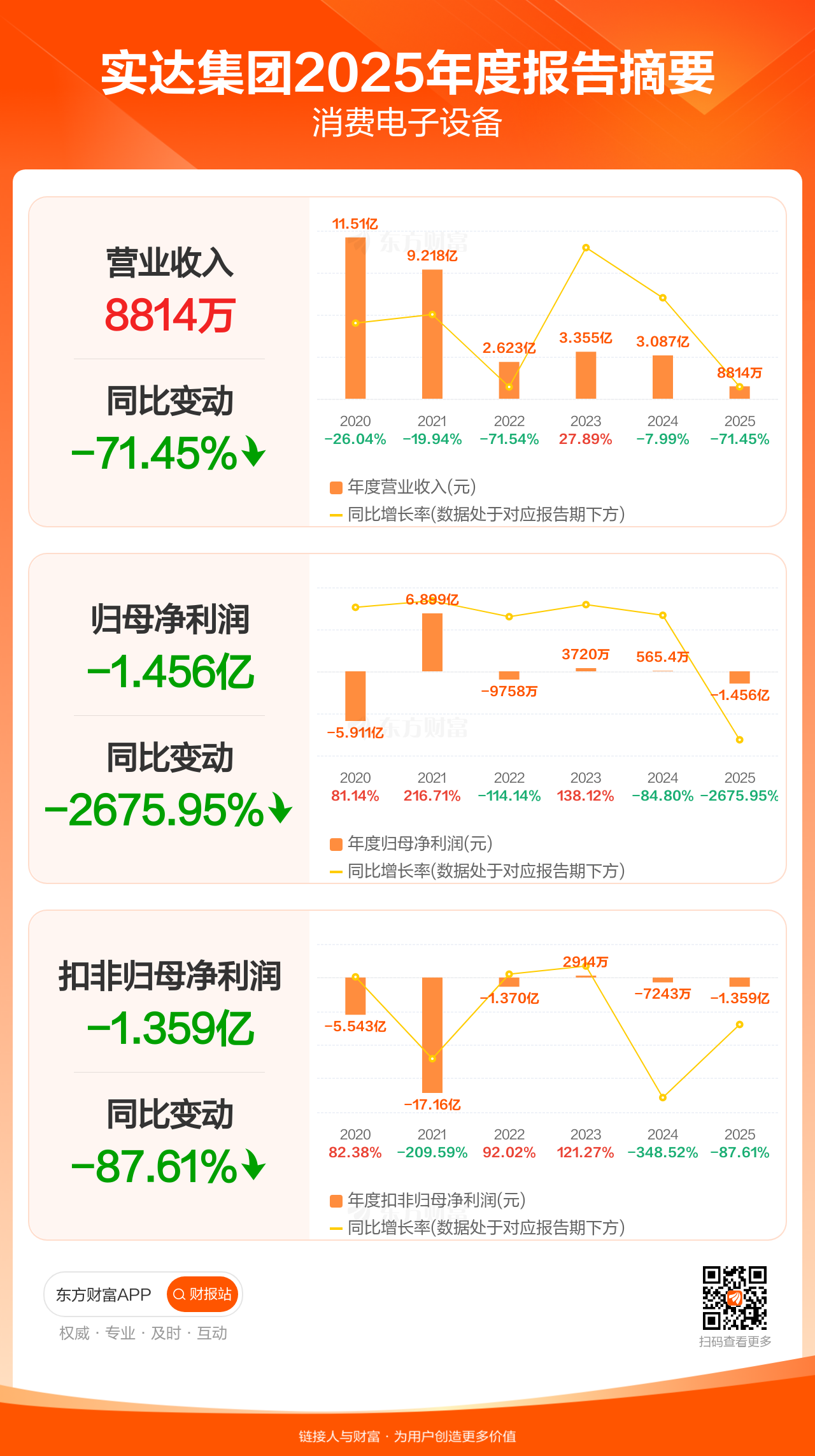 实达集团4月29日发布2025年年报显示,公司全年实现营业收入8813.98万元,同比下滑71.45%;归母净利润-1.46亿元;扣非归母净利润-1.36亿元。