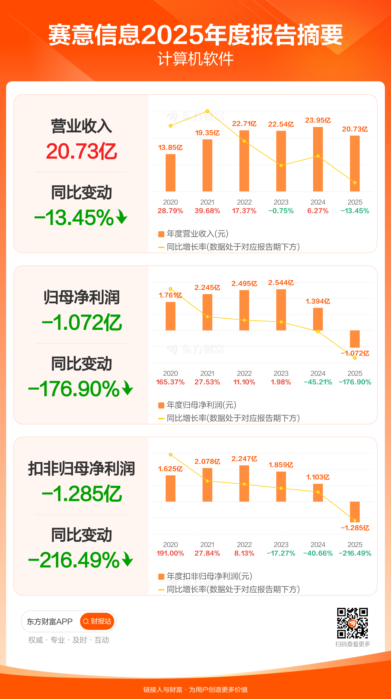 赛意信息4月29日发布2025年年报显示,公司全年实现营业收入20.73亿元,同比下滑13.45%;归母净利润-1.07亿元;扣非归母净利润-1.28亿元。