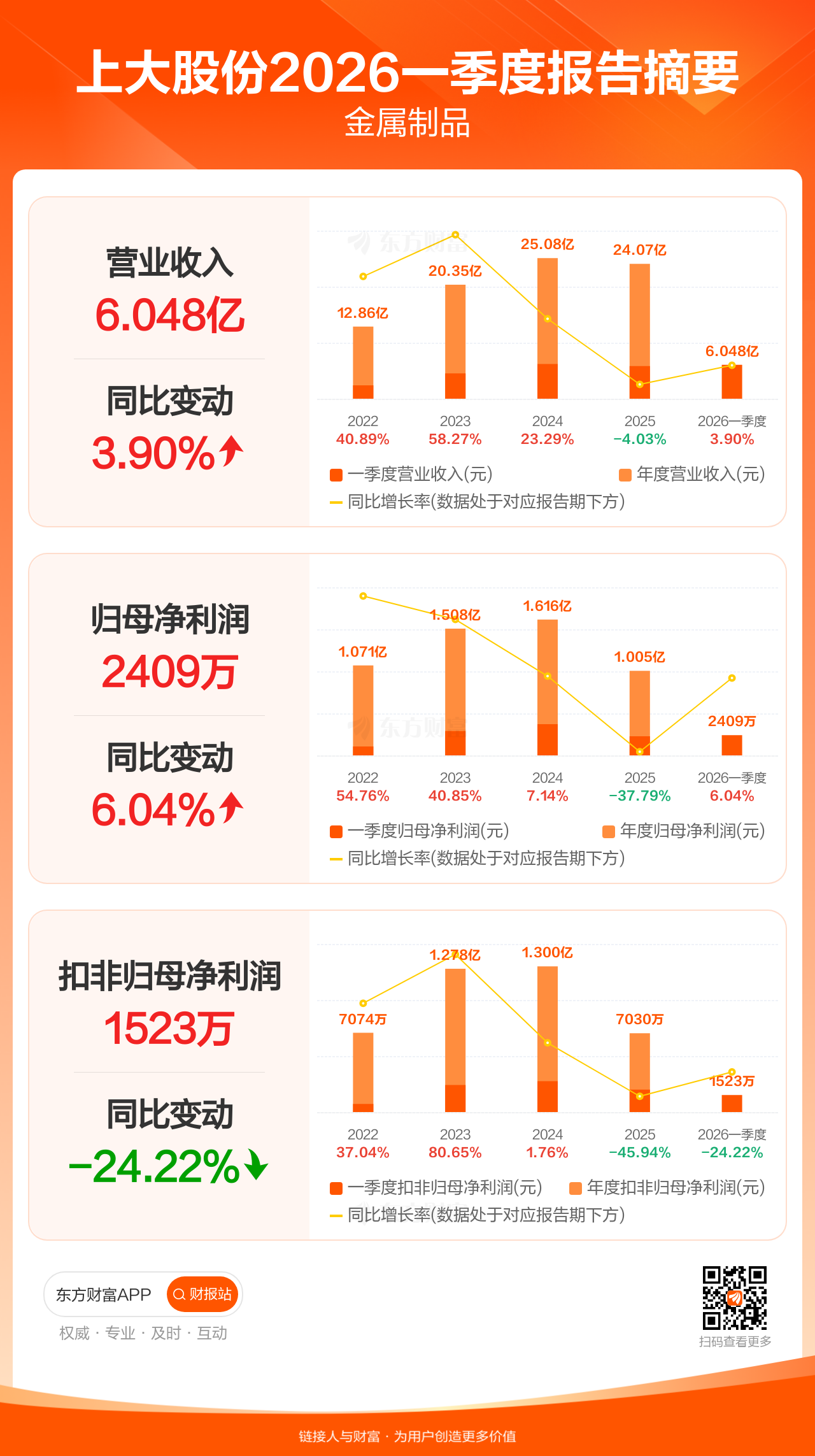 上大股份4月29日发布2026年一季报显示,公司一季度实现营业收入6.05亿元,同比增长3.90%;归母净利润2408.84万元,同比增长6.04%;扣非归母净利润1522.70万元,同比下滑24.22%。