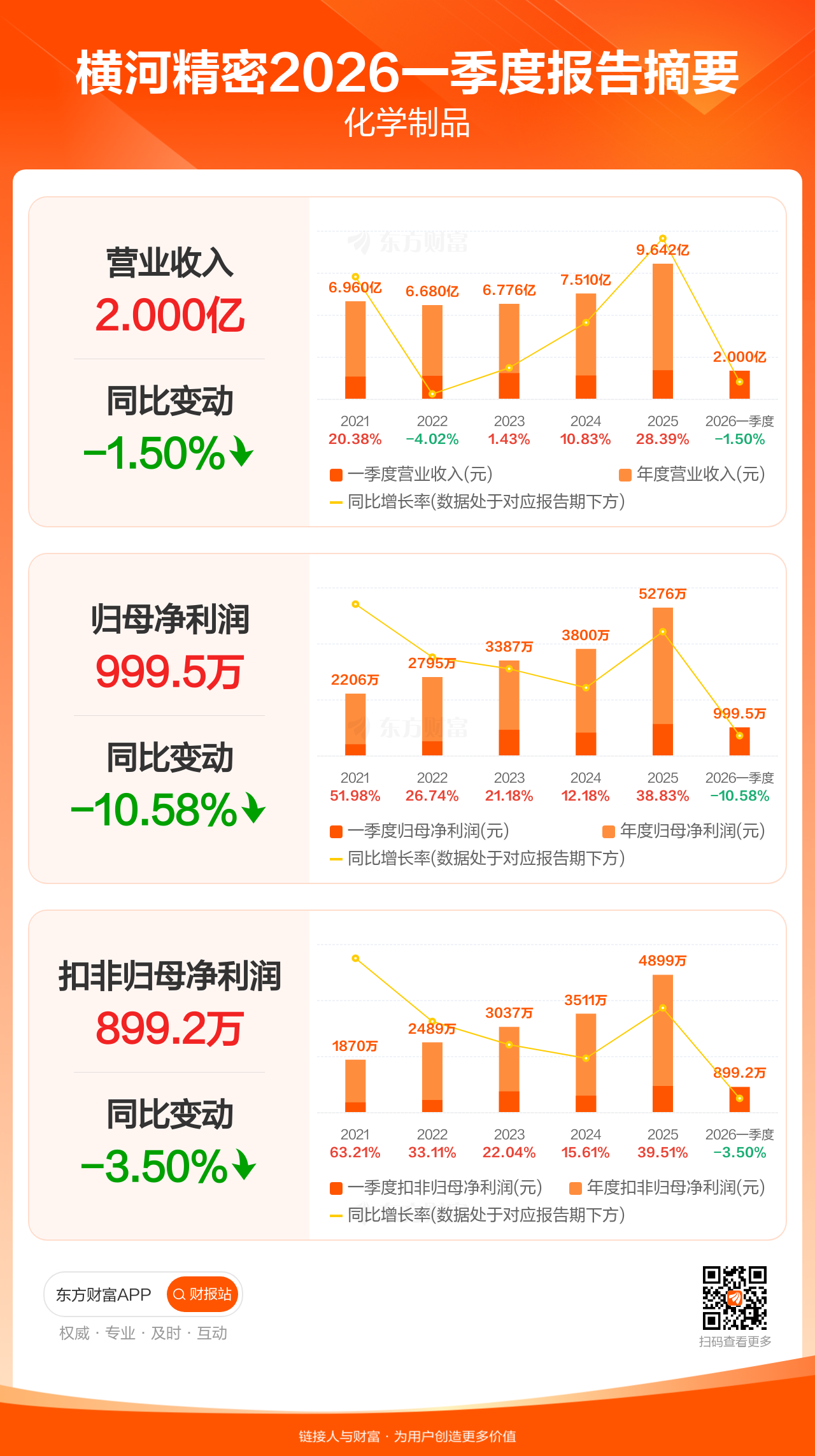 横河精密4月29日发布2026年一季报显示,公司一季度实现营业收入2.00亿元,同比下滑1.50%;归母净利润999.50万元,同比下滑10.58%;扣非归母净利润899.20万元,同比下滑3.50%。