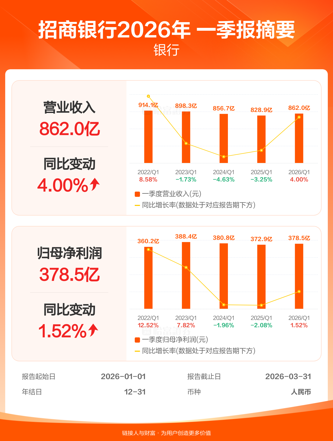 招商银行4月28日发布一季报业绩,截至2026年3月31日的3个月内,该公司营业收入862.05亿人民币,同比增长4.00%;公司权益持有人应占溢利(归母净利润)378.52亿人民币,同比增长1.52%。