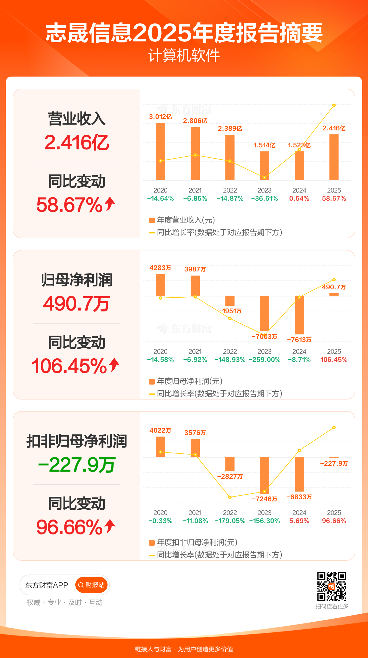 志晟信息4月28日发布2025年年报显示,公司全年实现营业收入2.42亿元,同比增长58.67%;归母净利润490.70万元,同比增长106.45%;扣非归母净利润-227.93万元。