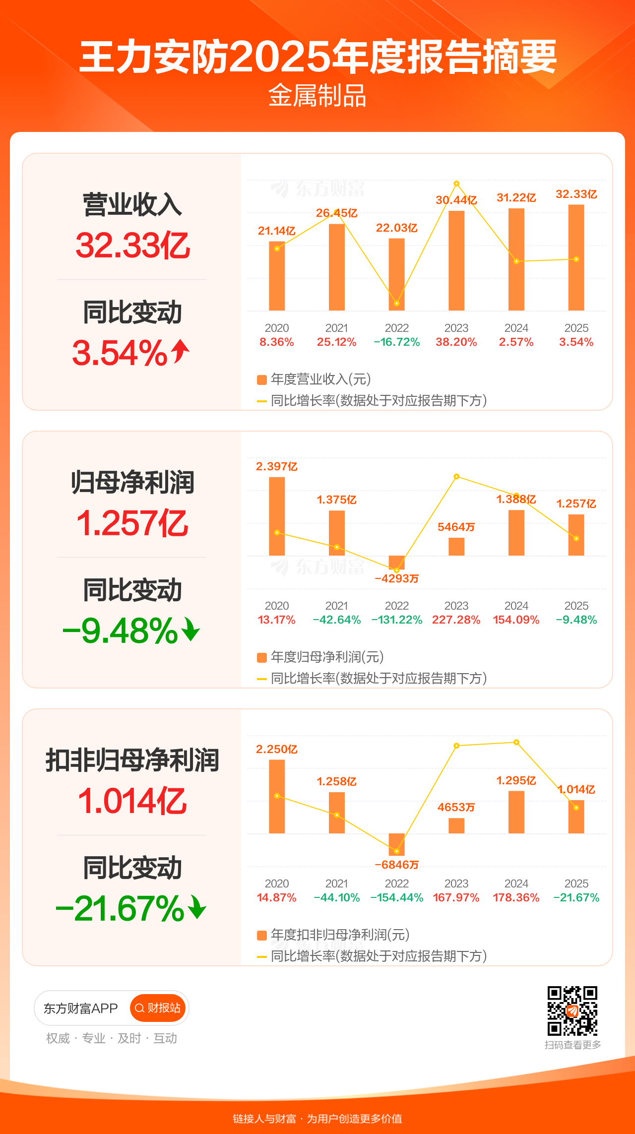 王力安防4月29日发布2025年年报显示,公司全年实现营业收入32.33亿元,同比增长3.54%;归母净利润1.26亿元,同比下滑9.48%;扣非归母净利润1.01亿元,同比下滑21.67%。