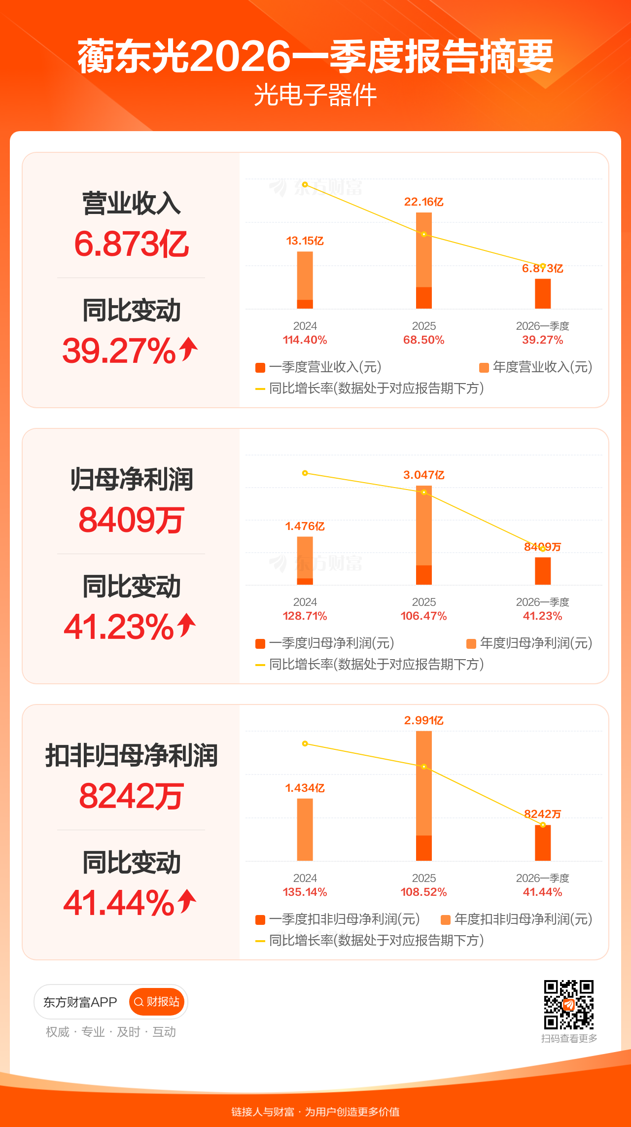 蘅东光4月28日发布2026年一季报显示,公司一季度实现营业收入6.87亿元,同比增长39.27%;归母净利润8408.95万元,同比增长41.23%;扣非归母净利润8242.26万元,同比增长41.44%。