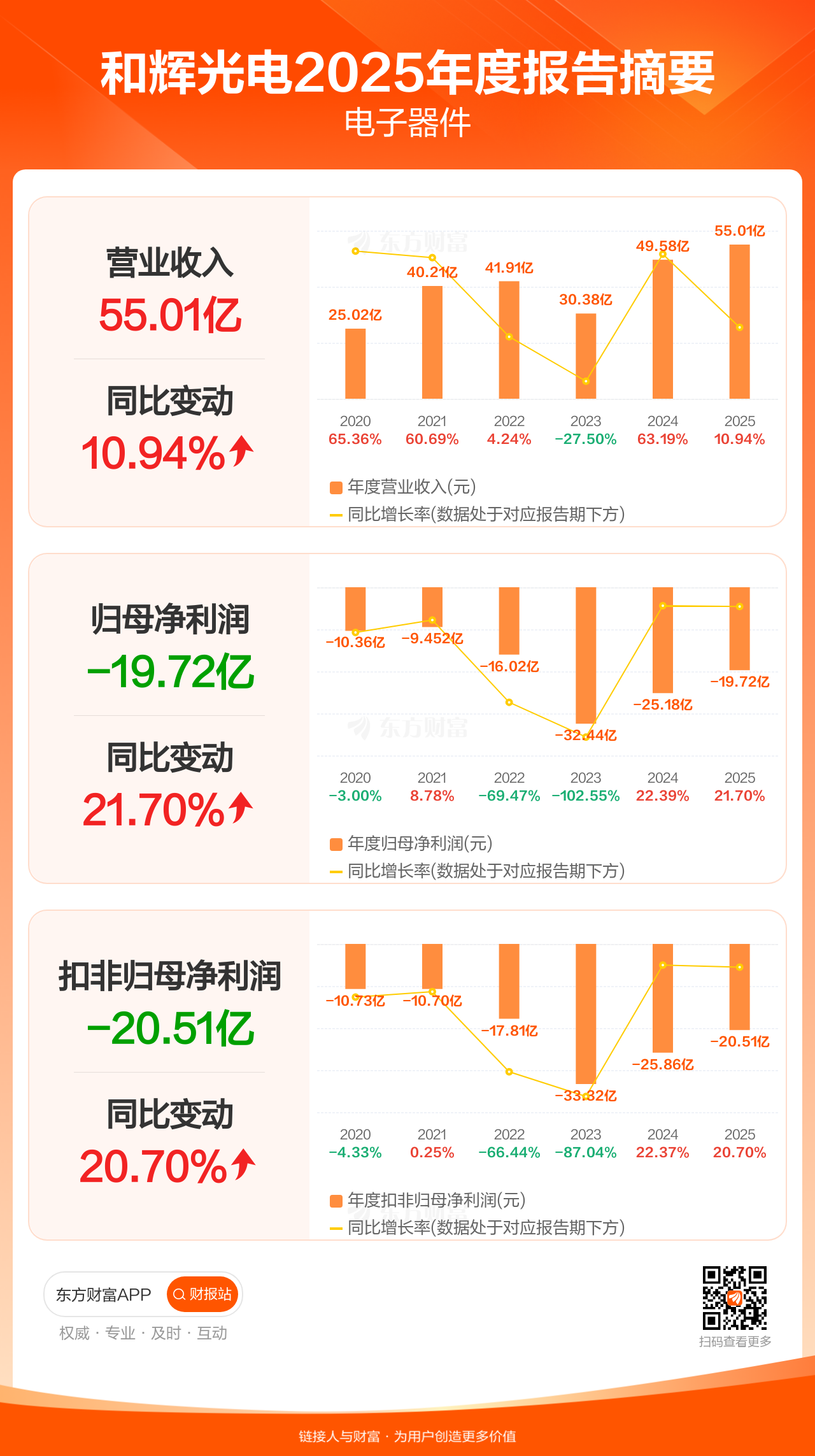 和辉光电4月29日发布2025年年报显示,公司全年实现营业收入55.01亿元,同比增长10.94%;归母净利润-19.72亿元;扣非归母净利润-20.51亿元。
