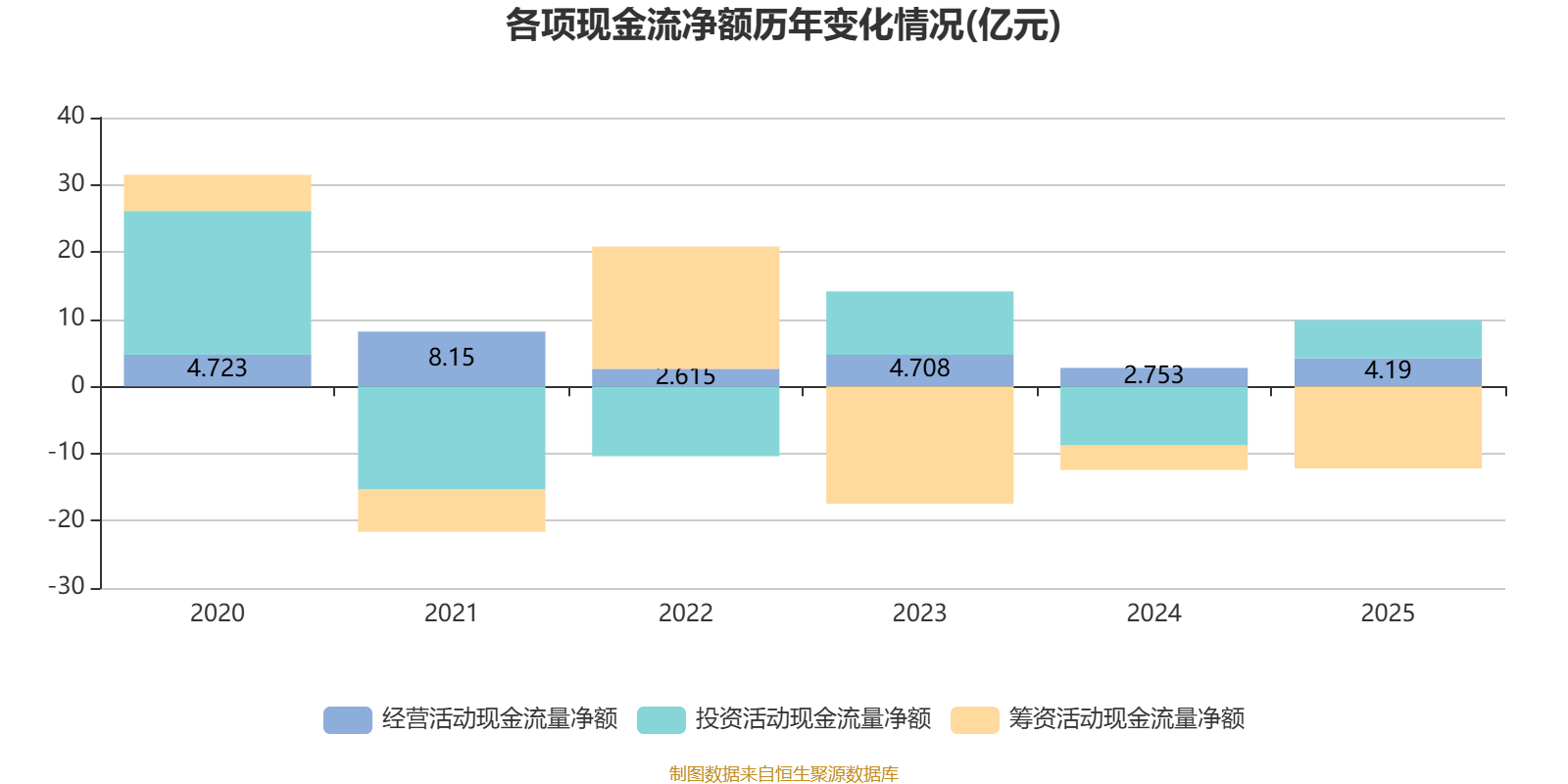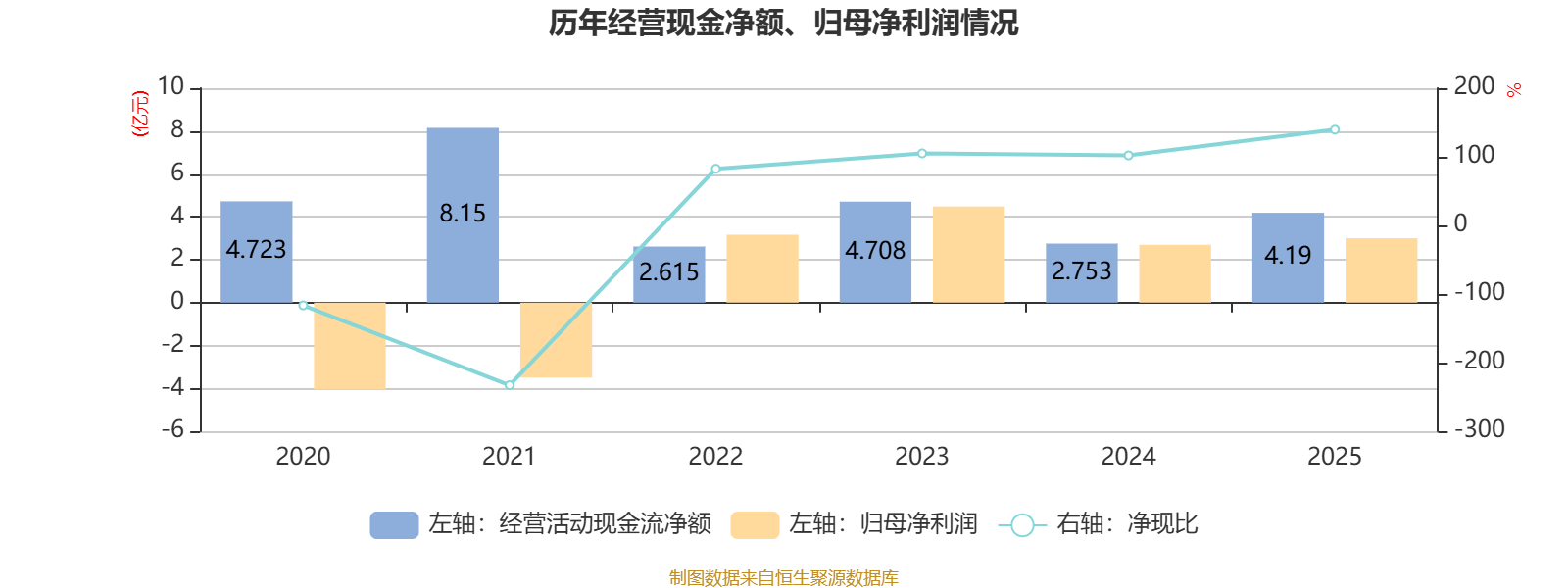 2025年,公司经营活动现金流净额为4.19亿元,同比增长52.2%;筹资活动现金流净额-12.22亿元,同比减少8.59亿元;投资活动现金流净额5.65亿元,上年同期为-8.8亿元。