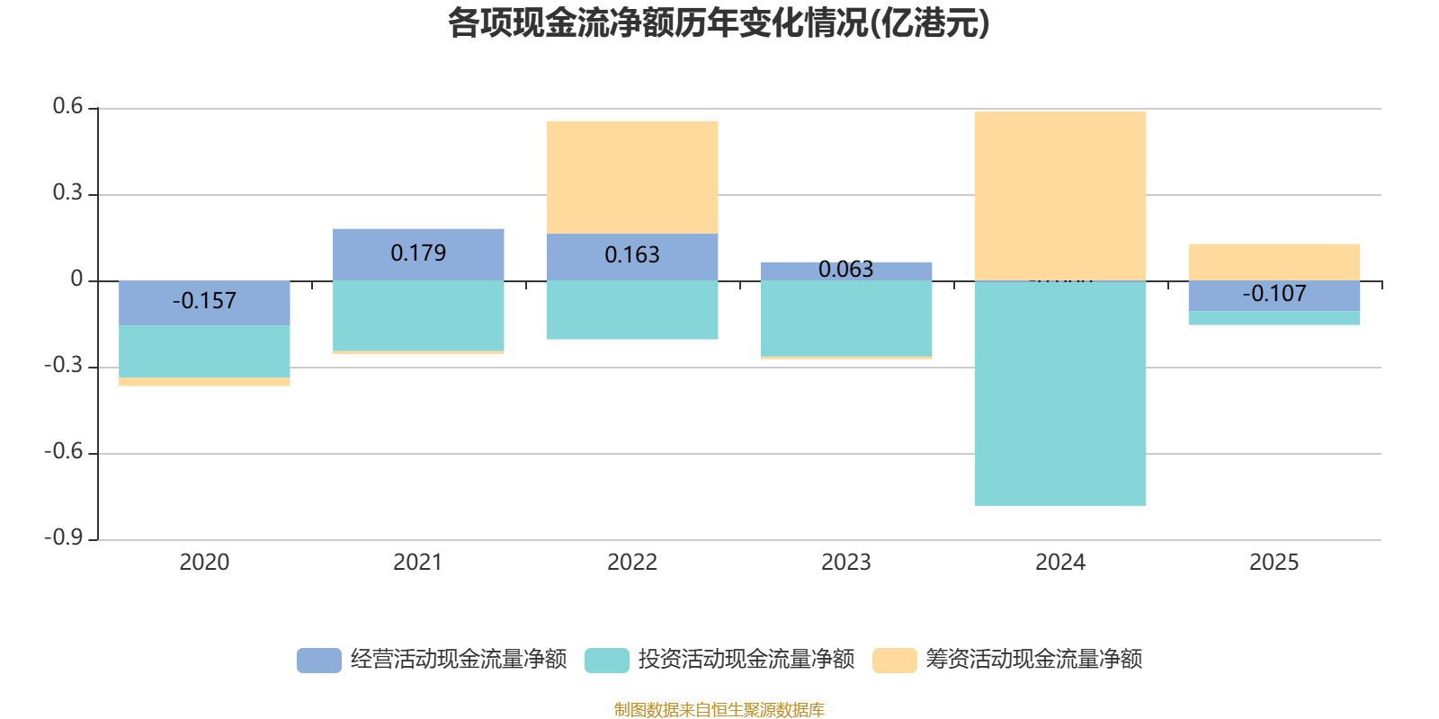 2025年,公司经营活动现金流净额为-1069.8万港元,同比减少1007.8万港元;筹资活动现金流净额1264.4万港元,同比减少4602.2万港元;投资活动现金流净额-478.8万港元,上年同期为-7780.4万港元。