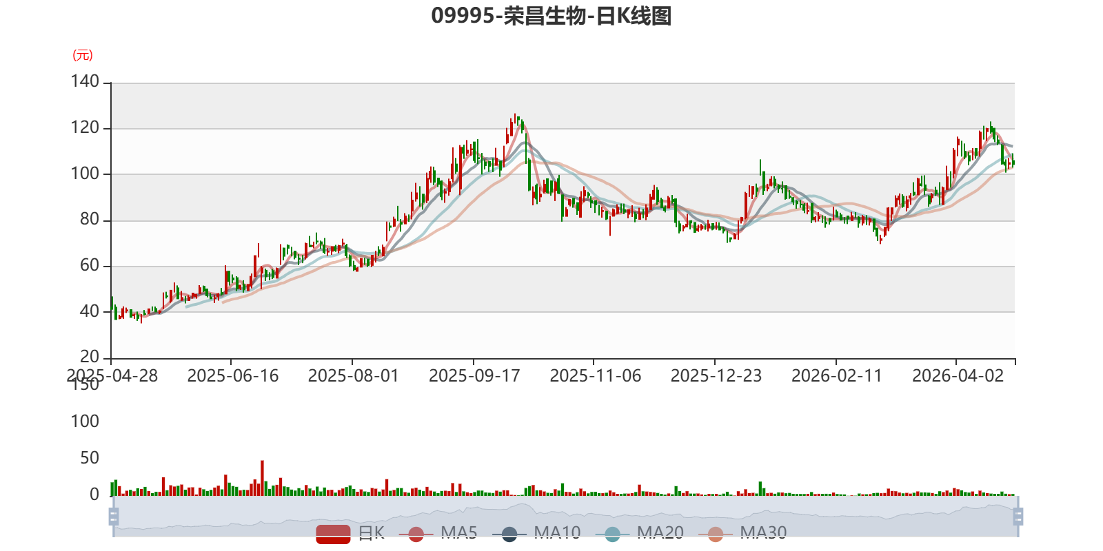 以4月28日收盘价计算,荣昌生物目前市盈率(TTM)约75.08倍,市净率(TTM)约14.76倍,市销率(TTM)约16.44倍。