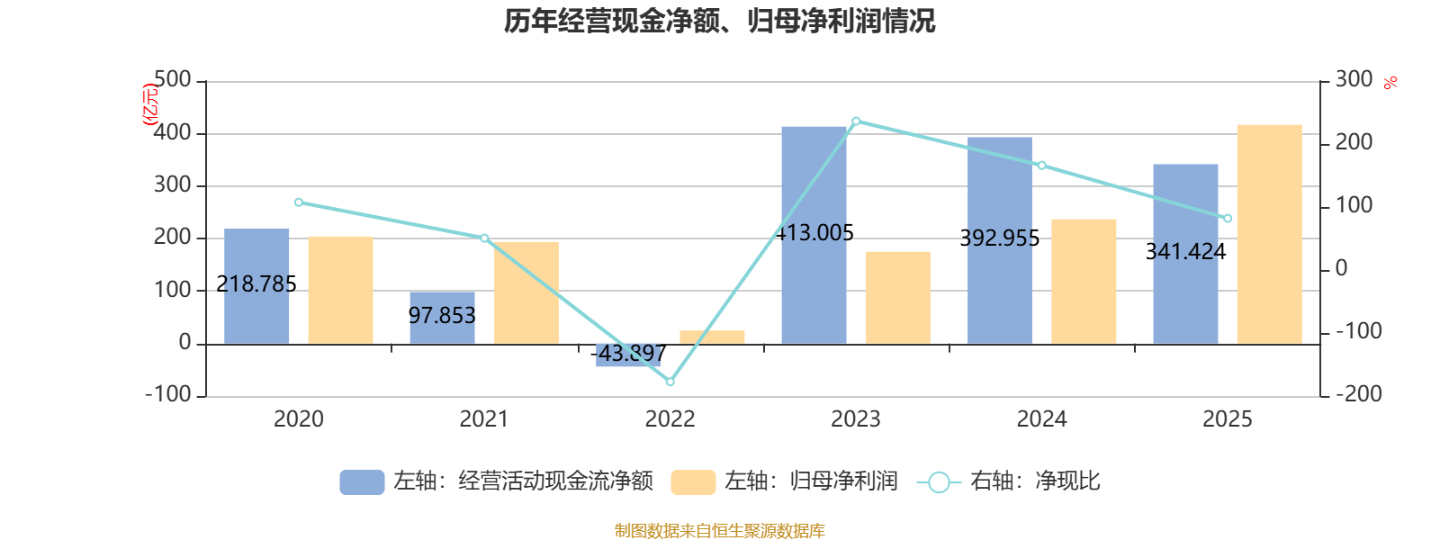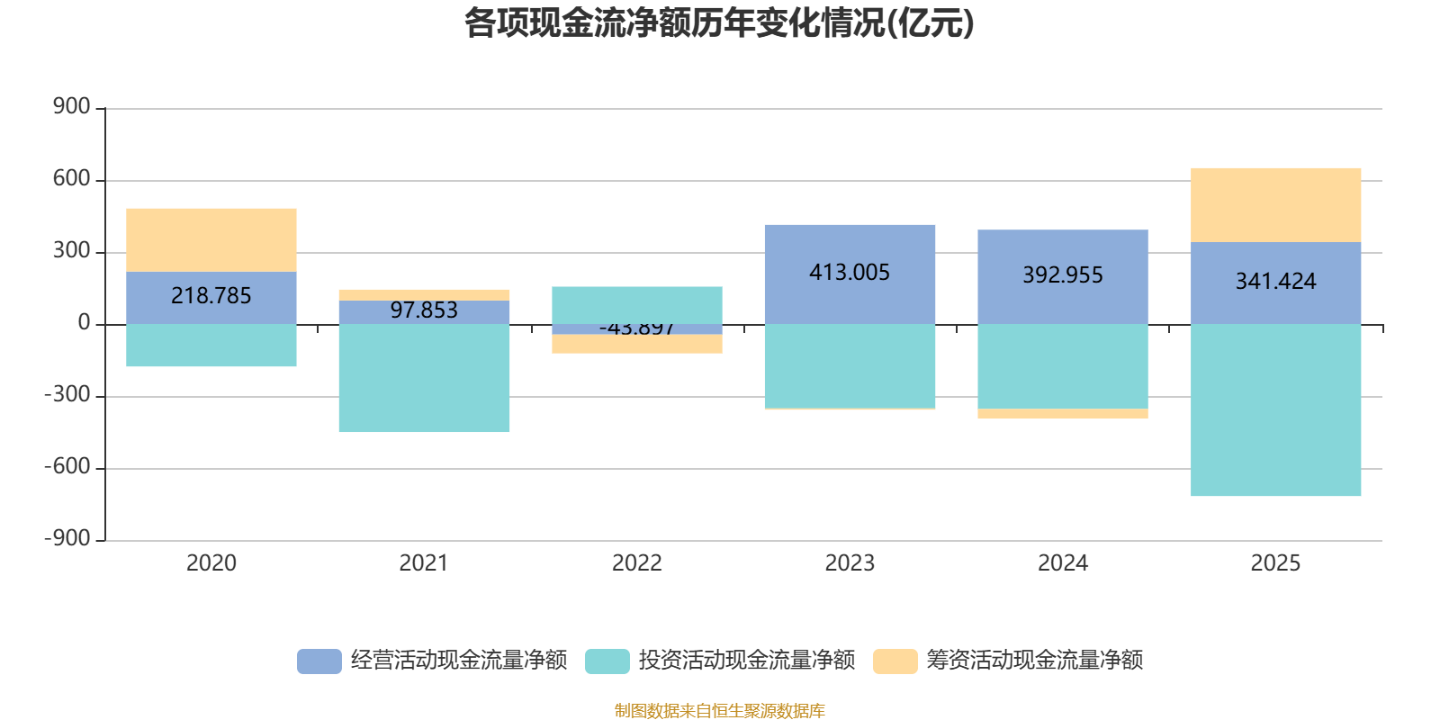 2025年,公司经营活动现金流净额为341.42亿元,同比下降13.11%;筹资活动现金流净额307.66亿元,同比增加347.65亿元;投资活动现金流净额-716.79亿元,上年同期为-353.86亿元。