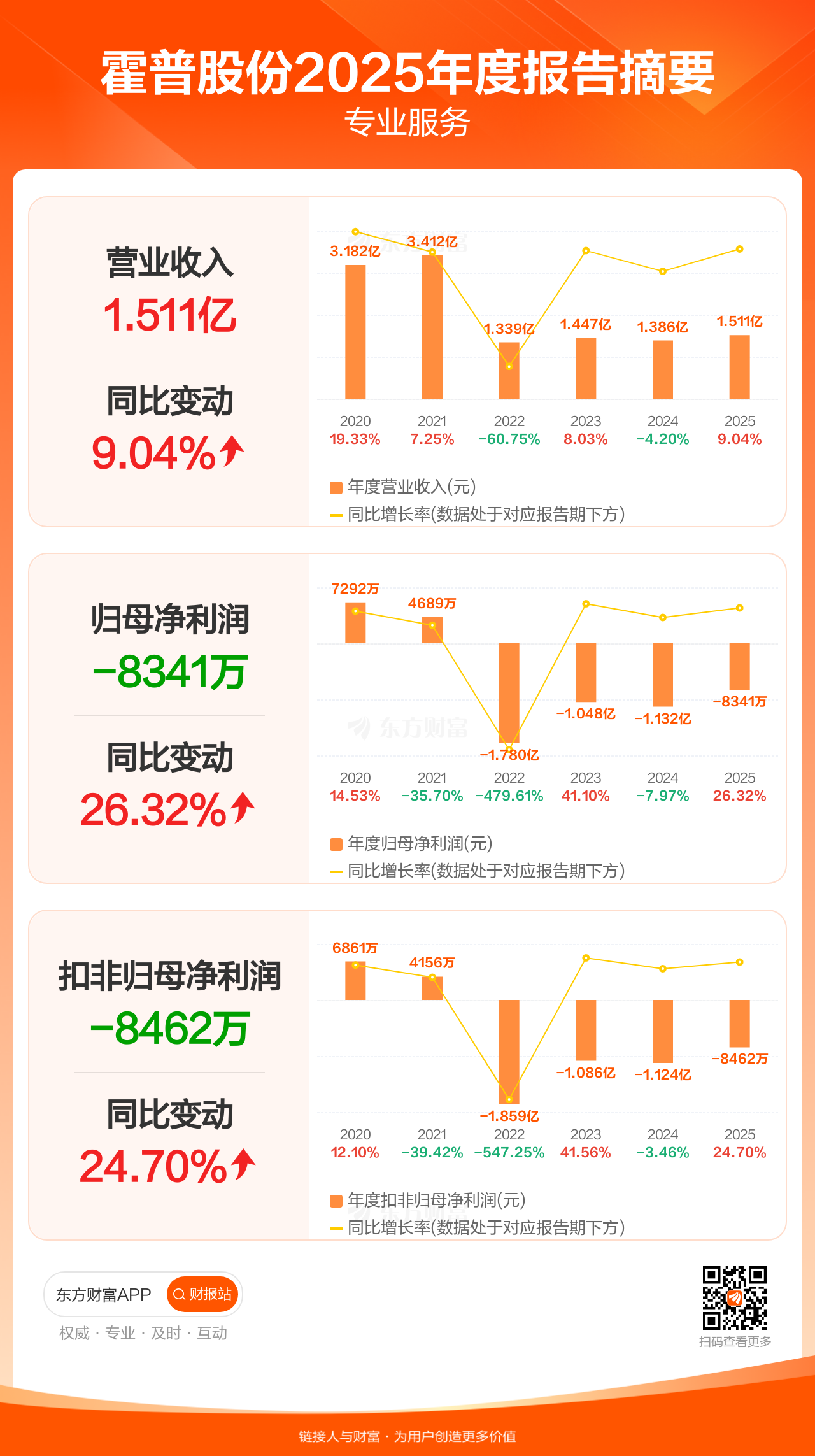 霍普股份4月29日发布2025年年报显示,公司全年实现营业收入1.51亿元,同比增长9.04%;归母净利润-8340.63万元;扣非归母净利润-8462.15万元。