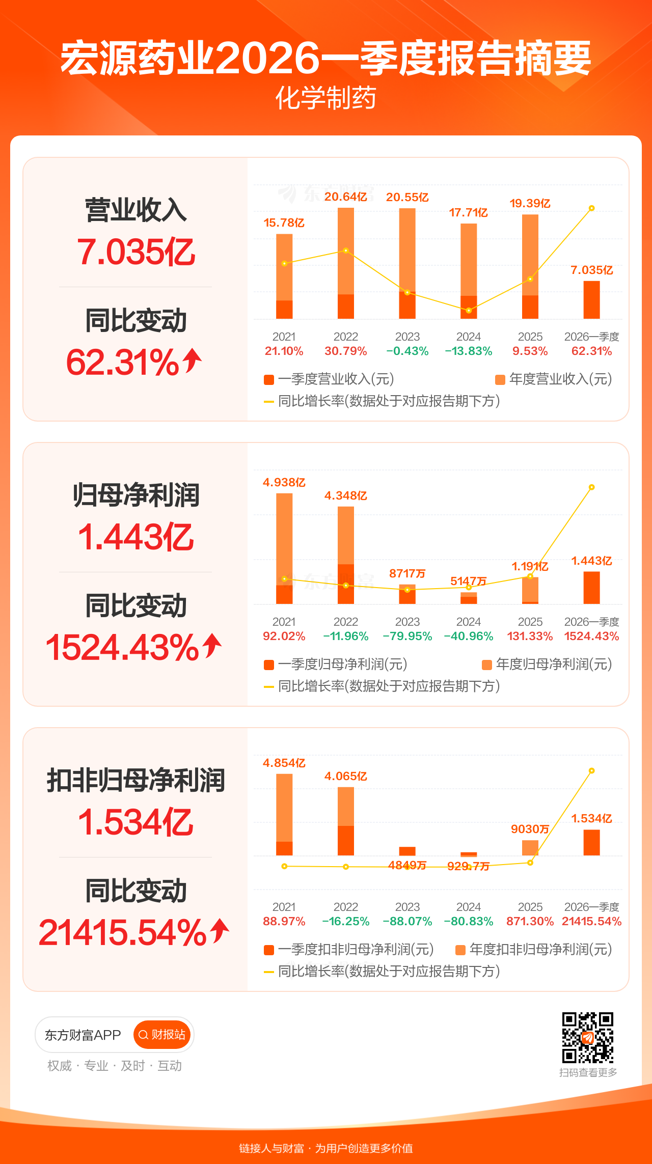 宏源药业4月29日发布2026年一季报显示,公司一季度实现营业收入7.04亿元,同比增长62.31%;归母净利润1.44亿元,同比增长1524.43%;扣非归母净利润1.53亿元,同比增长21415.54%。