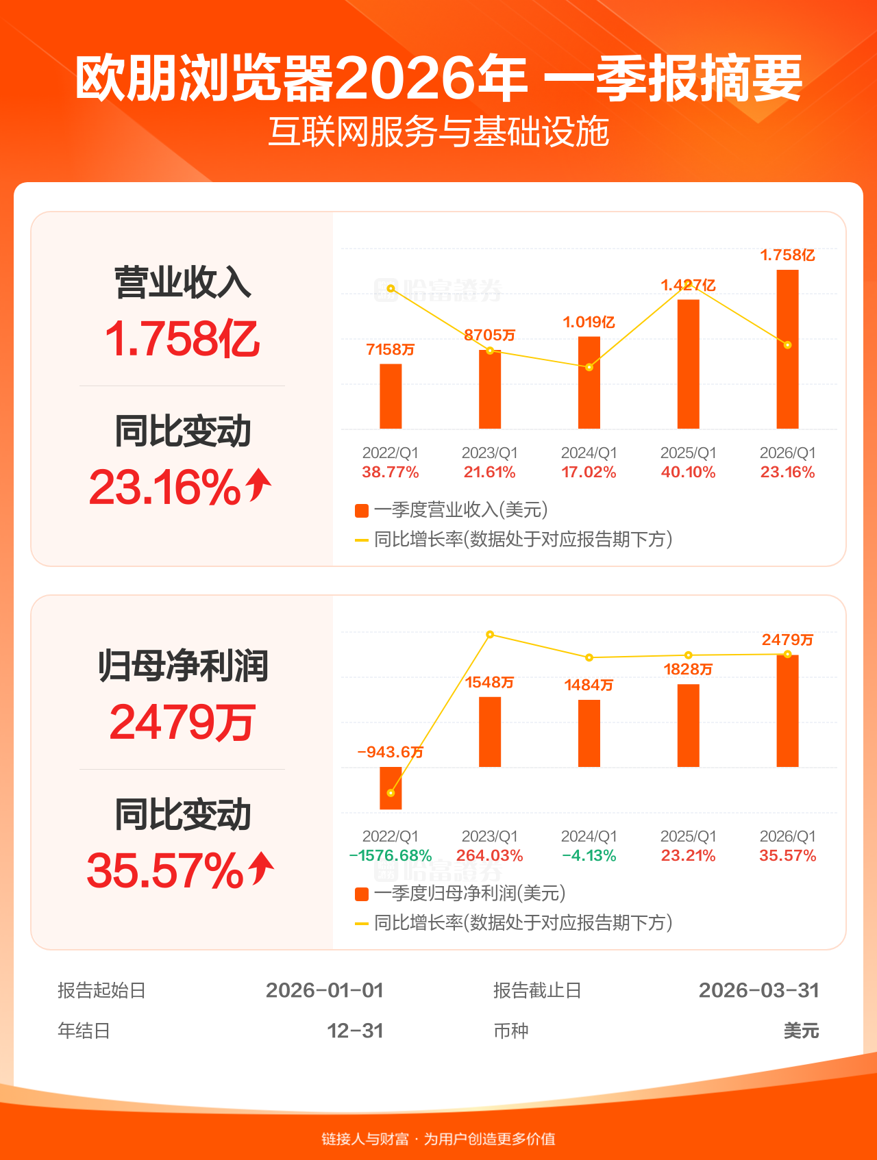 欧朋浏览器4月28日发布一季报业绩,截至2026年3月31日的3个月内,该公司营业收入1.76亿美元,同比增长23.16%;公司权益持有人应占溢利(归母净利润)2478.60万美元,同比增长35.57%。