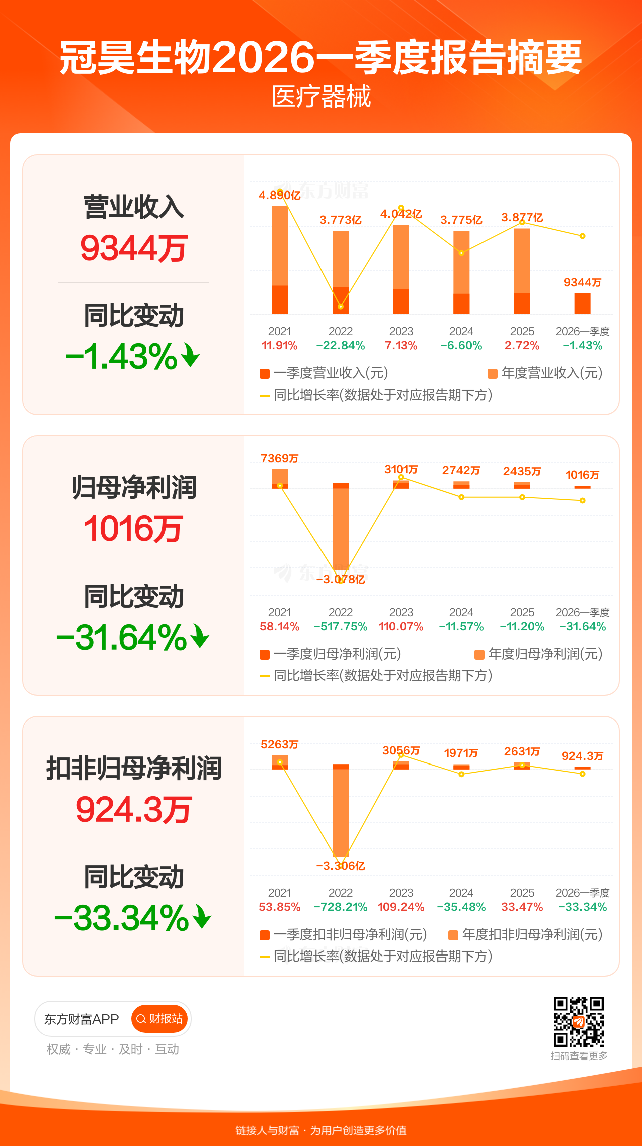 冠昊生物4月29日发布2026年一季报显示,公司一季度实现营业收入9344.40万元,同比下滑1.43%;归母净利润1016.23万元,同比下滑31.64%;扣非归母净利润924.27万元,同比下滑33.34%。