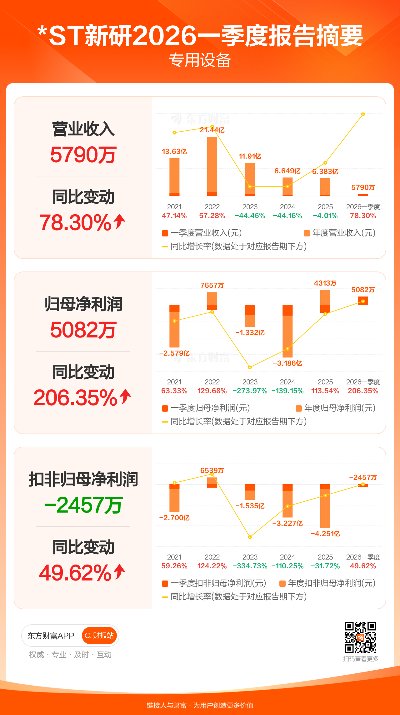 *ST新研4月29日发布2026年一季报显示,公司一季度实现营业收入5789.75万元,同比增长78.30%;归母净利润5082.20万元,同比增长206.35%;扣非归母净利润-2456.95万元。