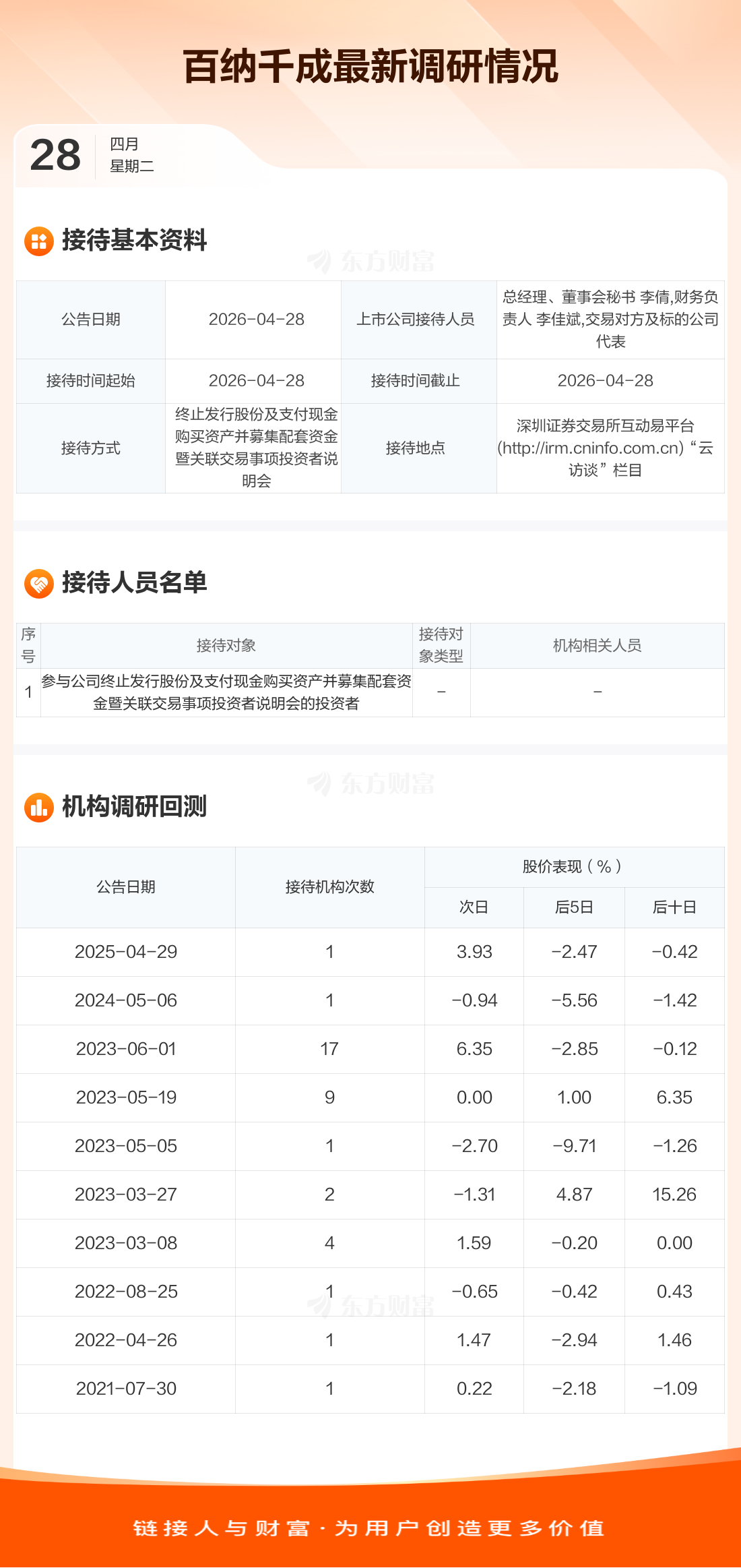 百纳千成4月28日公告称,4月28日接待参与公司终止发行股份及支付现金购买资产并募集配套资金暨关联交易事项投资者说明会的投资者调研。接待人员包括总经理、董事会秘书 李倩,财务负责人 李佳斌,交易对方及标的公司代表。