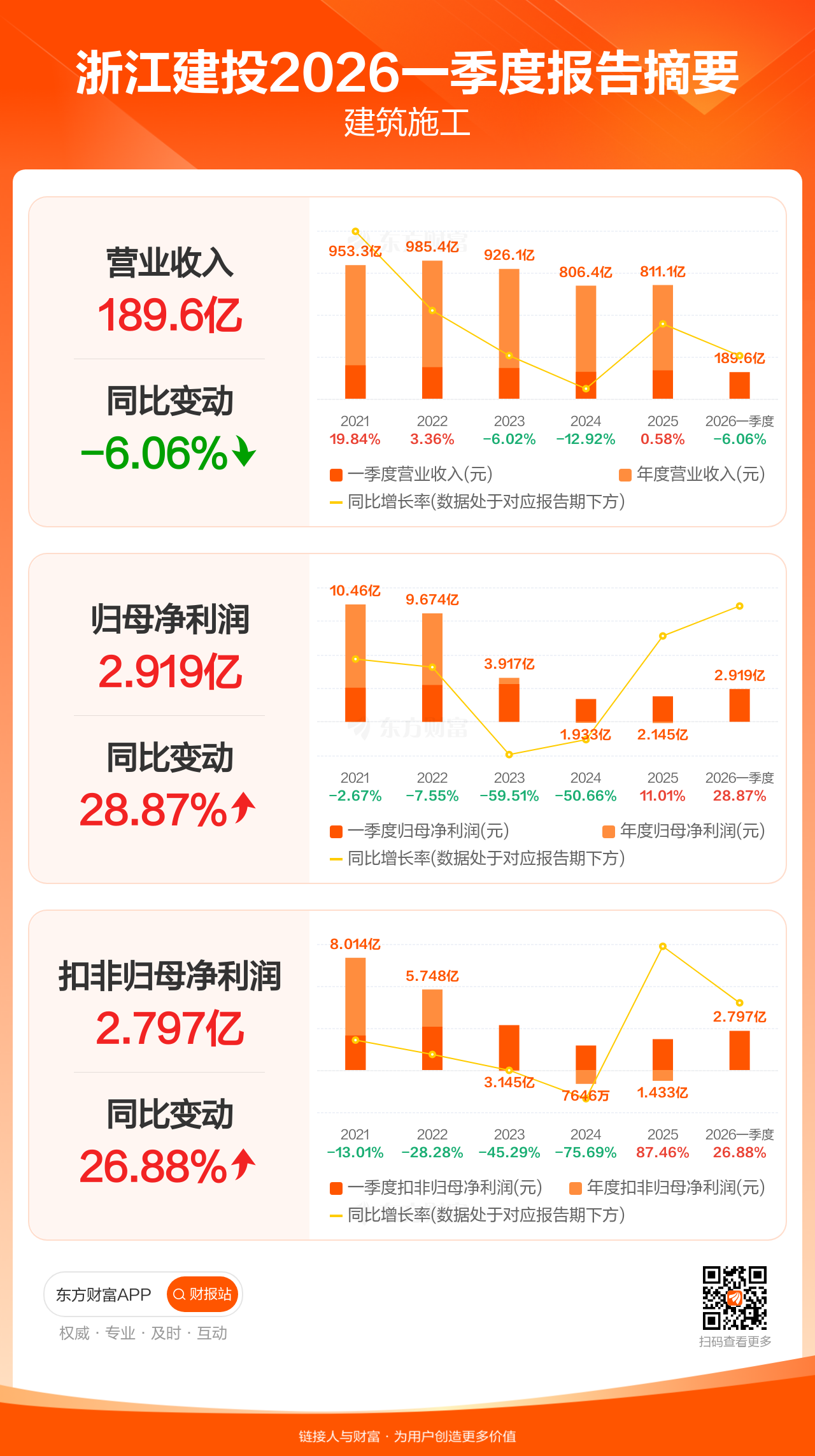 浙江建投4月29日发布2026年一季报显示,公司一季度实现营业收入189.59亿元,同比下滑6.06%;归母净利润2.92亿元,同比增长28.87%;扣非归母净利润2.80亿元,同比增长26.88%。