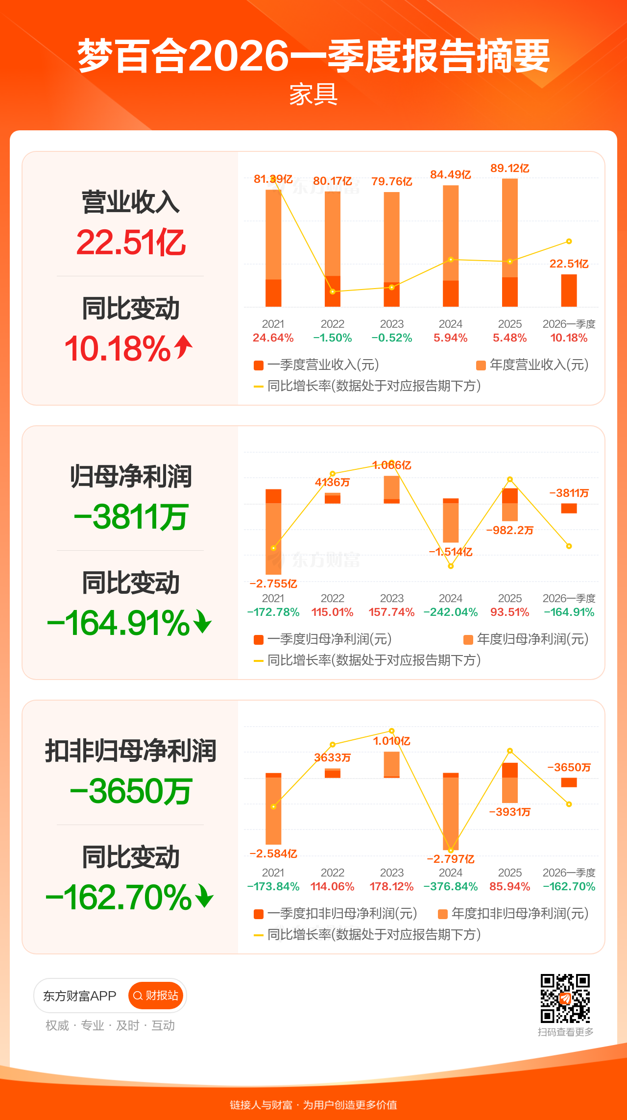 梦百合4月29日发布2026年一季报显示,公司一季度实现营业收入22.51亿元,同比增长10.18%;归母净利润-3811.26万元;扣非归母净利润-3649.96万元。