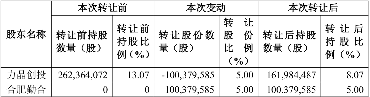 公告指出,本次协议转让系转让方力晶创投基于自身投资规划安排以及支持上市公司优化股权结构、引入产业投资者,受让方合肥勤合基于对公司长期投资价值的认可而发生的股份变动。