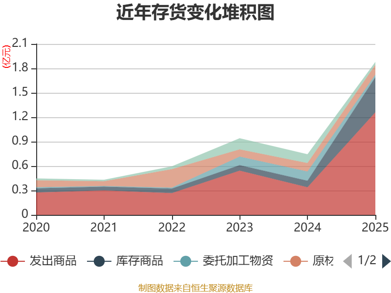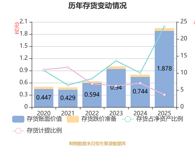 从存货变动来看,截至2025年末,公司存货账面价值为1.88亿元,占净资产的23.65%,较上年末增加1.13亿元。其中,存货跌价准备为702.5万元,计提比例为3.61%。