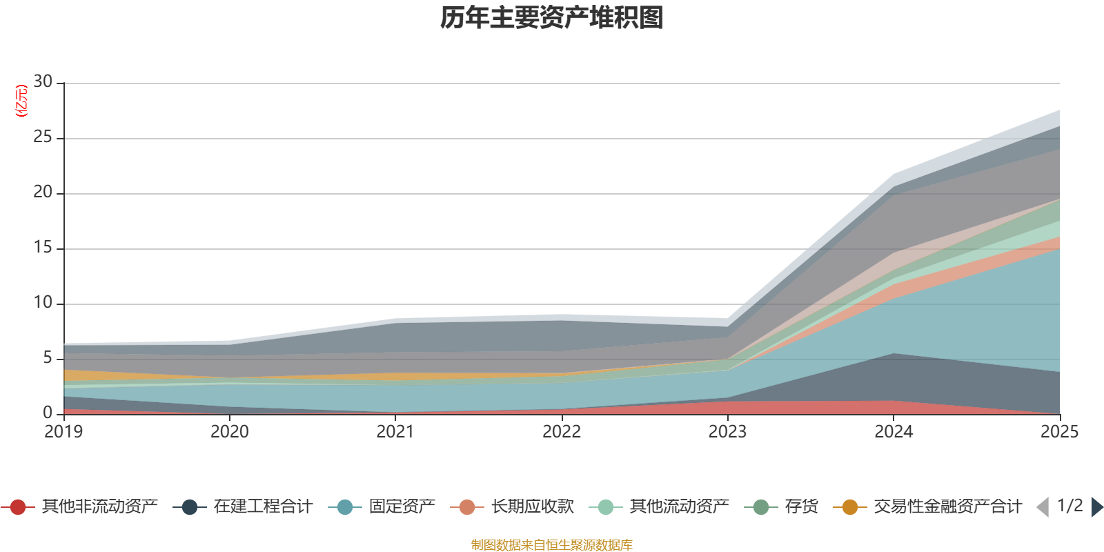 资产重大变化方面,截至2025年末,公司固定资产较上年末增加124.84%,占公司总资产比重上升17.65个百分点;应收票据及应收账款较上年末减少14.11%,占公司总资产比重下降7.72个百分点;其他应收款(含利息和股利)较上年末减少93.52%,占公司总资产比重下降6.86个百分点;在建工程合计较上年末减少10.98%,占公司总资产比重下降5.87个百分点。