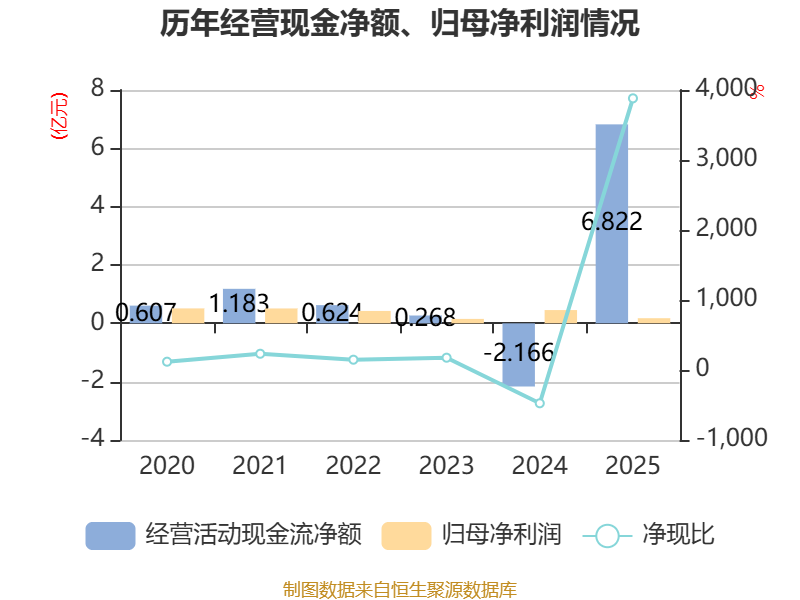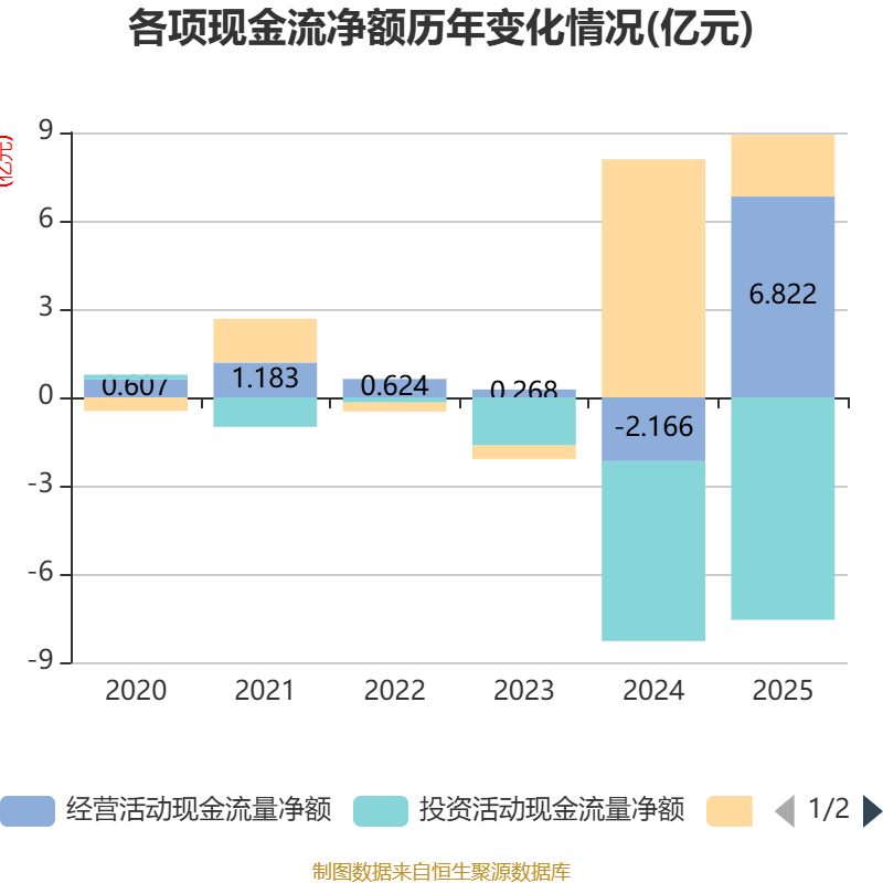 截至2025年,公司经营活动现金流净额为6.82亿元,同比增加8.99亿元;筹资活动现金流净额2.09亿元,同比减少6亿元;投资活动现金流净额-7.56亿元,上年同期为-6.11亿元。