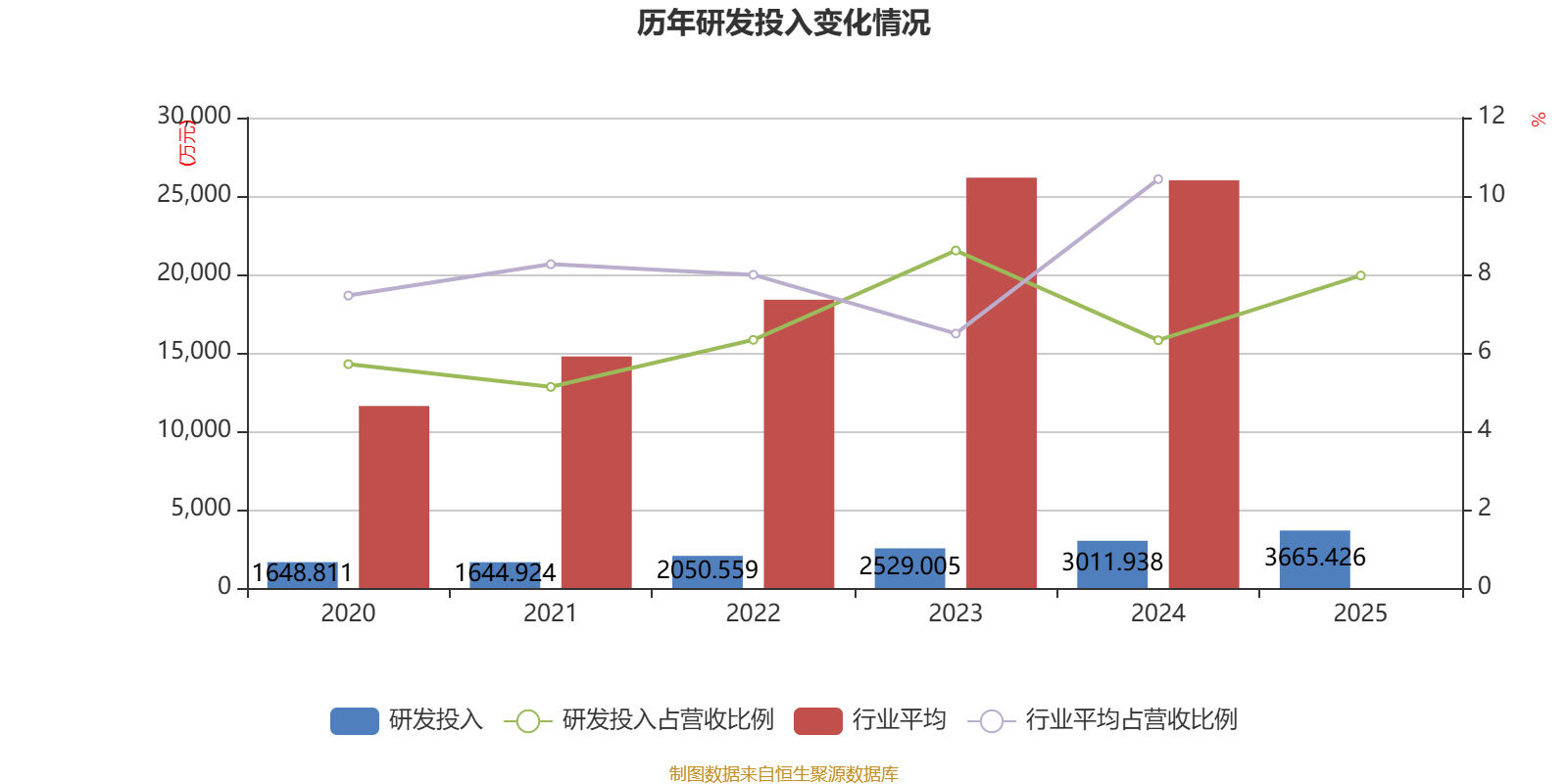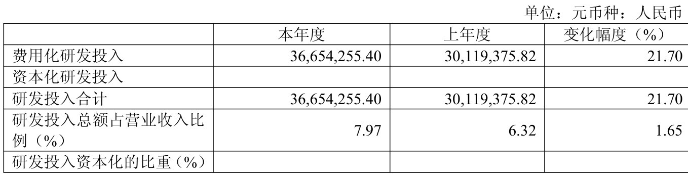 2025年全年,公司研发投入金额为3665.43万元,同比增长21.7%;研发投入占营业收入比例为7.97%,相比上年同期上升1.65个百分点。