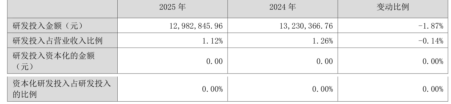 2025年全年,公司研发投入金额为1298.28万元,同比下降1.87%;研发投入占营业收入比例为1.12%,相比上年同期下降0.14个百分点。此外,公司全年研发投入资本化率为0%。