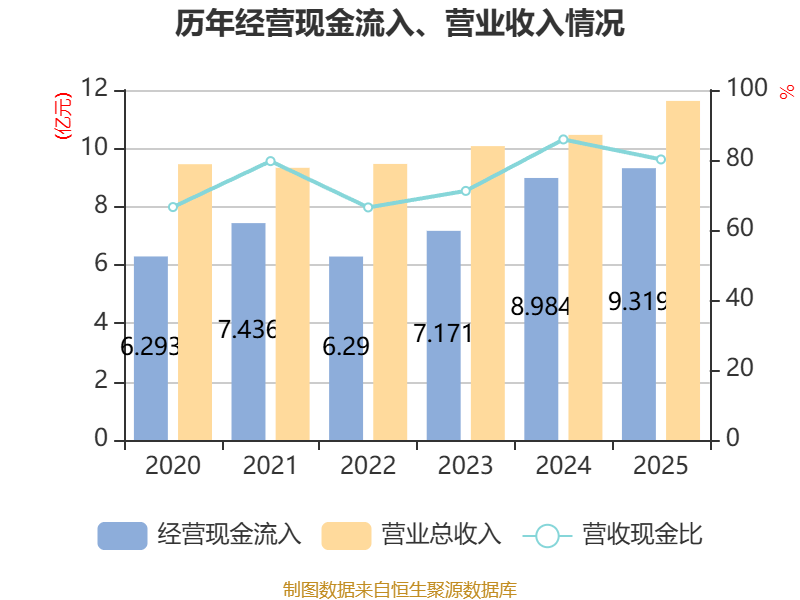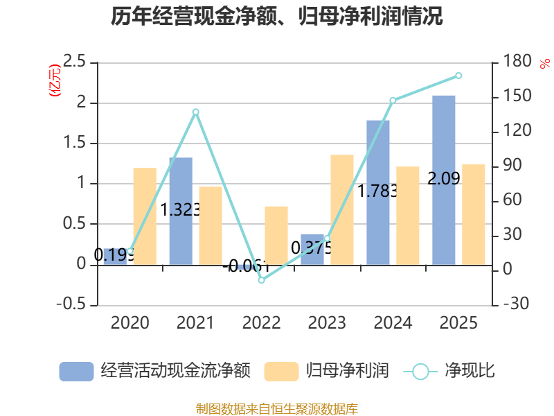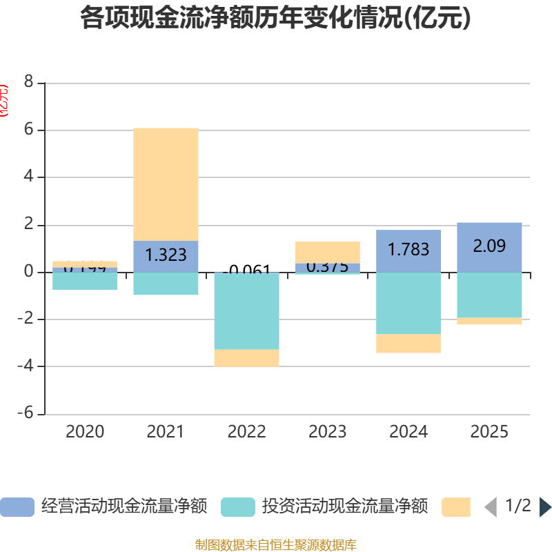 截至2025年,公司经营活动现金流净额为2.09亿元,同比增长17.19%;筹资活动现金流净额-2799.38万元,同比增加5087.16万元;投资活动现金流净额-1.93亿元,上年同期为-2.63亿元。