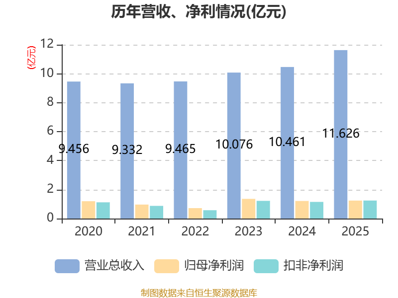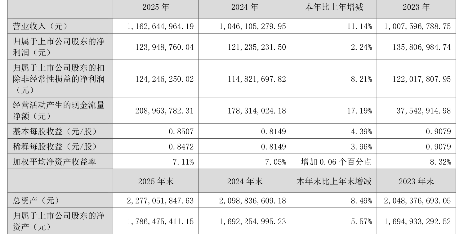 中证智能财讯长江材料(001296)4月29日披露2025年年度报告。2025年,公司实现营业总收入11.63亿元,同比增长11.14%;归母净利润1.24亿元,同比增长2.24%;扣非净利润1.24亿元,同比增长8.21%;经营活动产生的现金流量净额为2.09亿元,同比增长17.19%;报告期内,长江材料基本每股收益为0.8507元,加权平均净资产收益率为7.11%。公司2025年度分配预案为:拟向全体股东每10股派现2元(含税)。