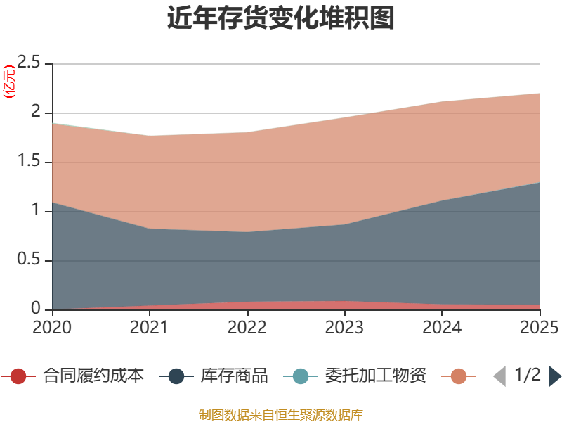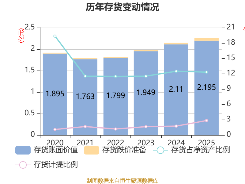 从存货变动来看,截至2025年末,公司存货账面价值为2.19亿元,占净资产的12.29%,较上年末增加849.43万元。其中,存货跌价准备为636.61万元,计提比例为2.82%。