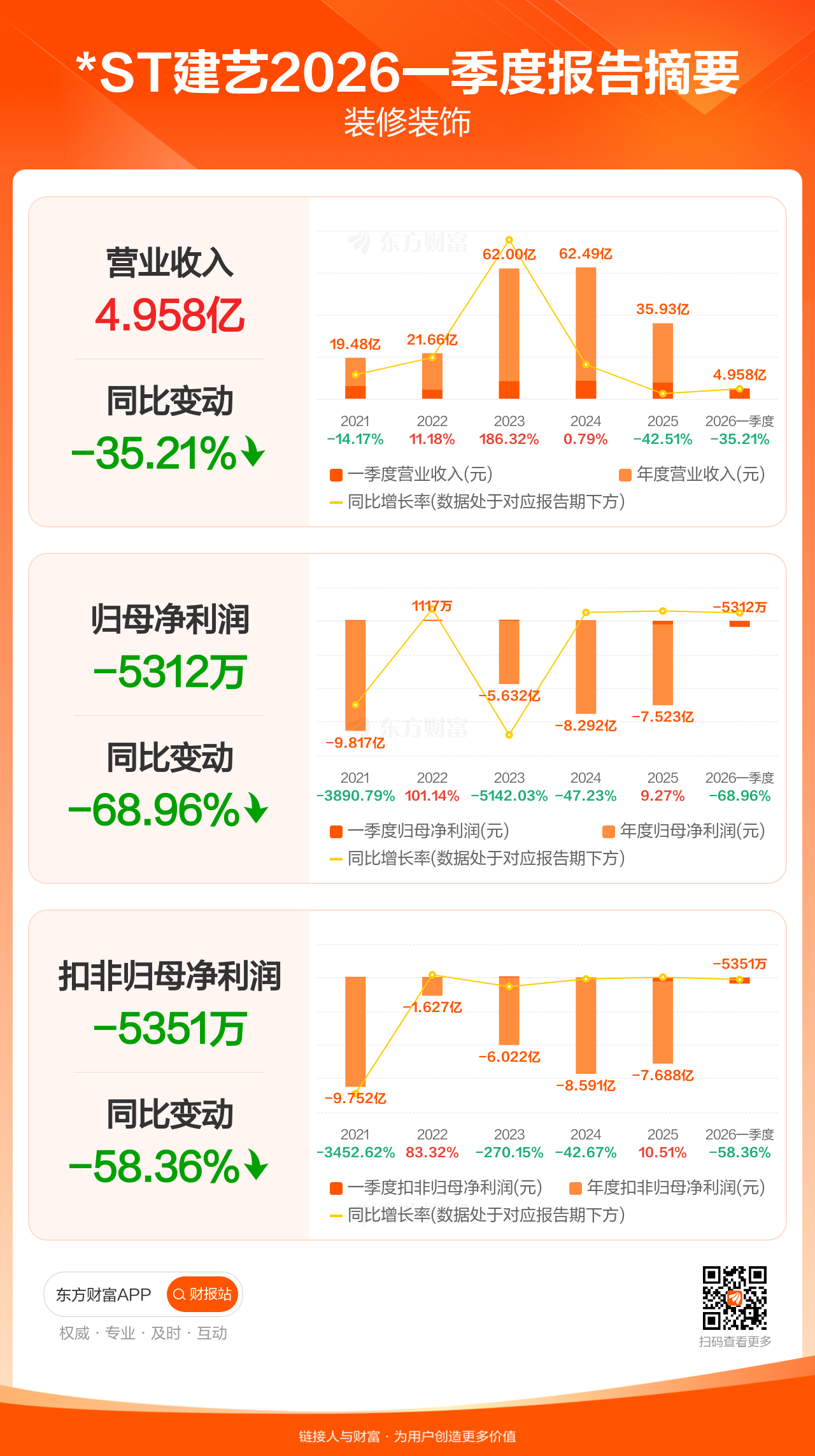 *ST建艺4月29日发布2026年一季报显示,公司一季度实现营业收入4.96亿元,同比下滑35.21%;归母净利润-5311.52万元;扣非归母净利润-5351.19万元。