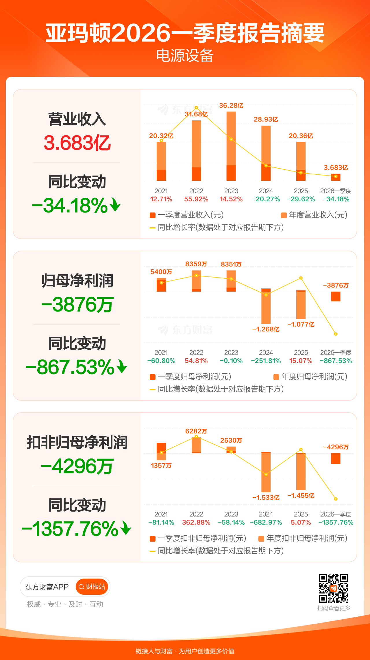 亚玛顿4月29日发布2026年一季报显示,公司一季度实现营业收入3.68亿元,同比下滑34.18%;归母净利润-3875.57万元;扣非归母净利润-4295.88万元。