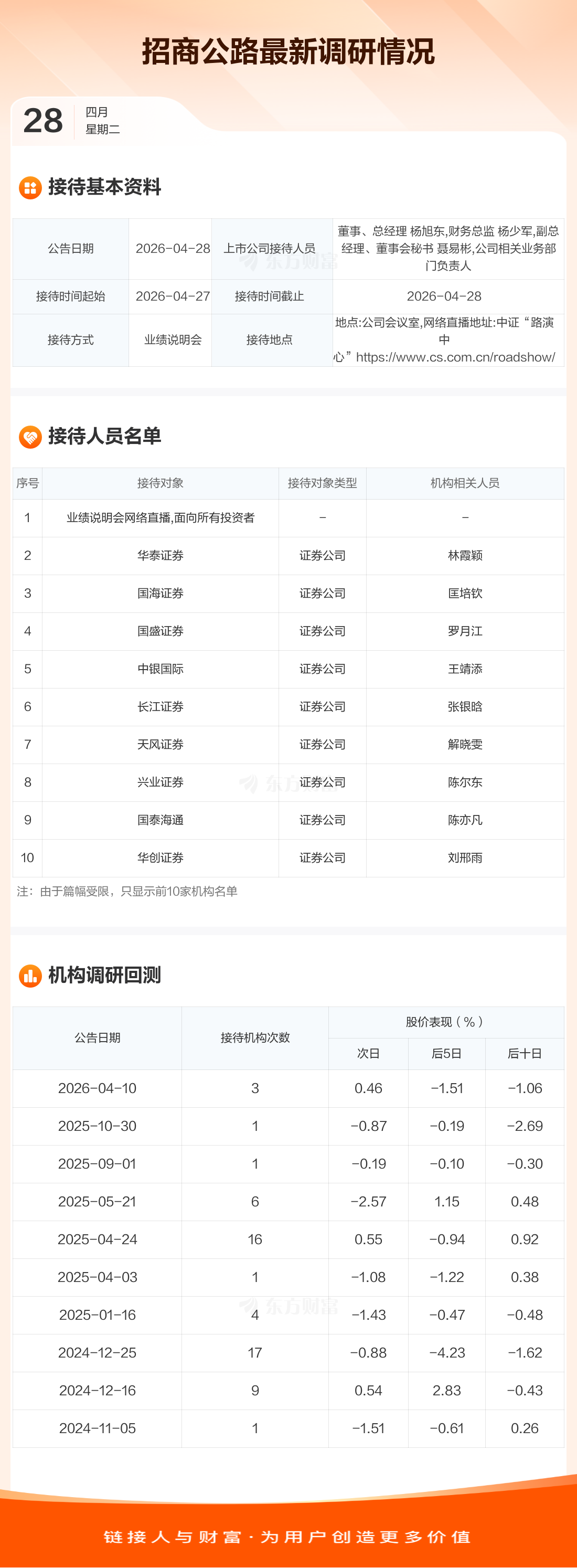 招商公路4月28日公告称,4月27日至4月28日接待业绩说明会网络直播,面向所有投资者等22家机构调研。接待人员包括董事、总经理 杨旭东,财务总监 杨少军,副总经理、董事会秘书 聂易彬,公司相关业务部门负责人。