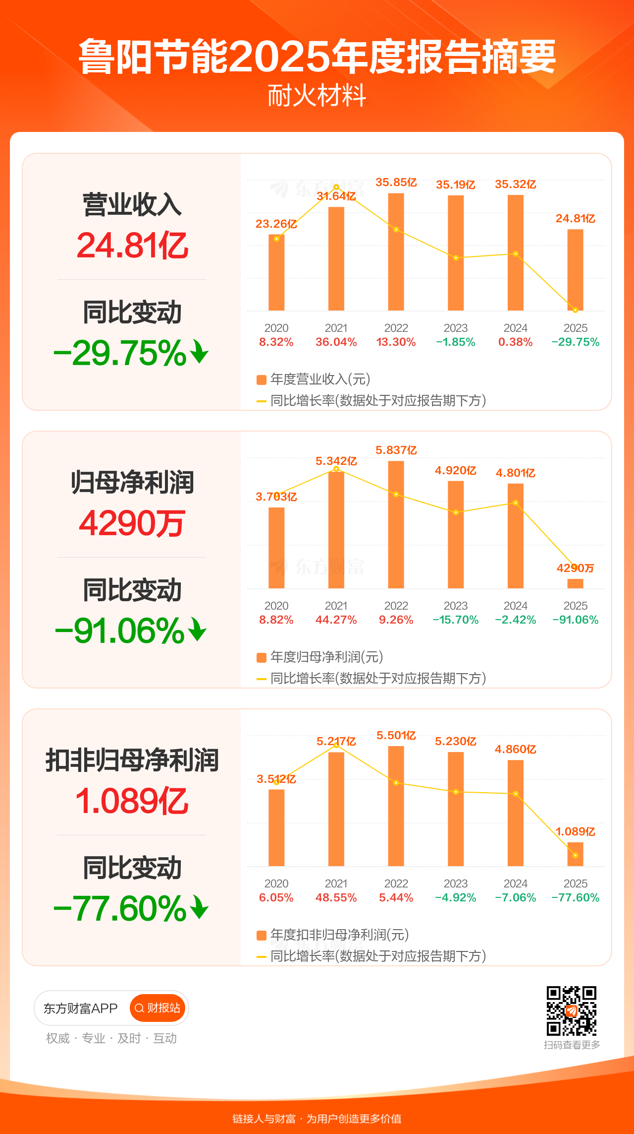 鲁阳节能4月29日发布2025年年报显示,公司全年实现营业收入24.81亿元,同比下滑29.75%;归母净利润4290.32万元,同比下滑91.06%;扣非归母净利润1.09亿元,同比下滑77.60%。