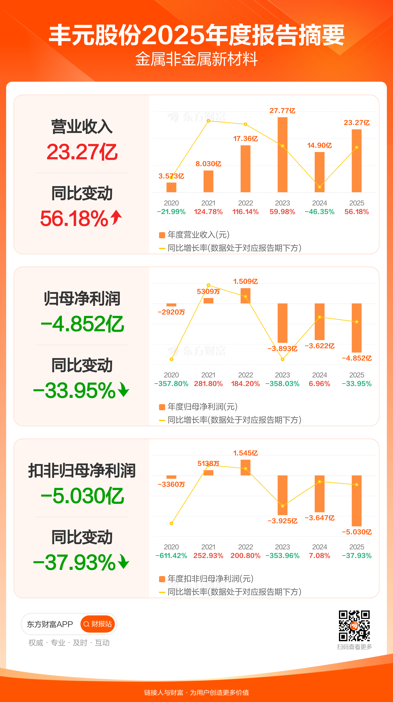 丰元股份4月29日发布2025年年报显示,公司全年实现营业收入23.27亿元,同比增长56.18%;归母净利润-4.85亿元;扣非归母净利润-5.03亿元。