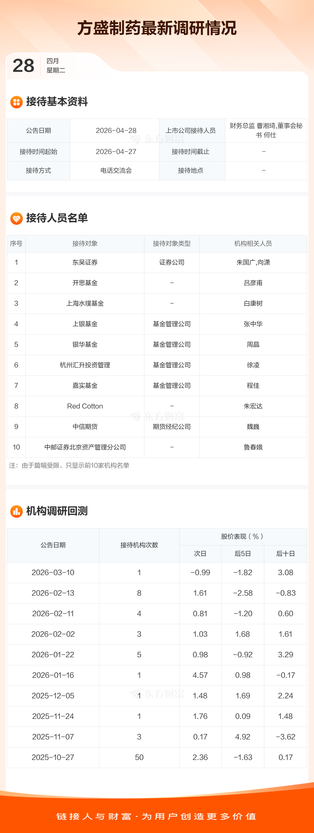 方盛制药4月28日公告称,4月27日接待东吴证券等37家机构调研。接待人员包括财务总监 曹湘琦,董事会秘书 何仕。