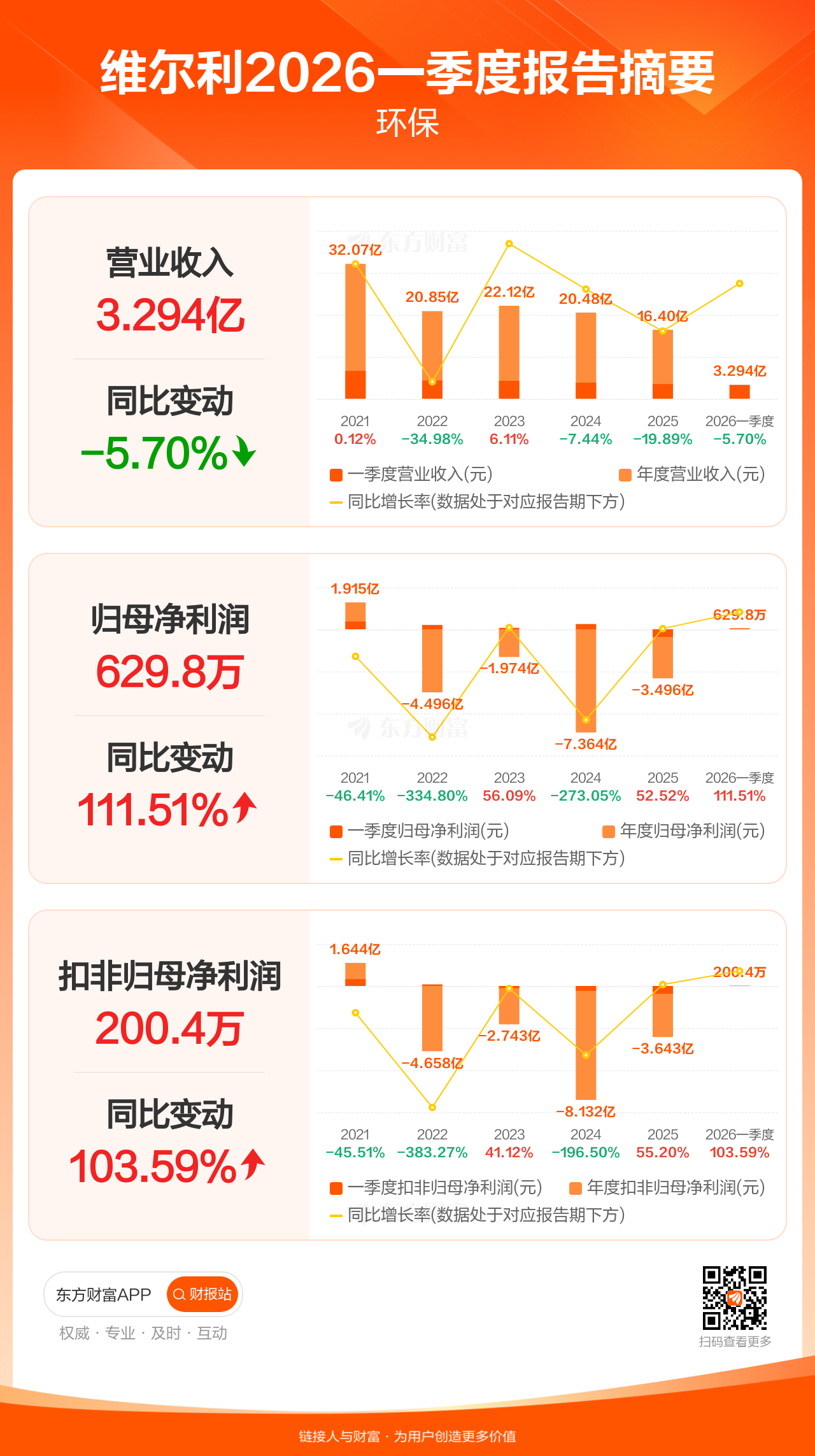 维尔利4月29日发布2026年一季报显示,公司一季度实现营业收入3.29亿元,同比下滑5.70%;归母净利润629.75万元,同比增长111.51%;扣非归母净利润200.38万元,同比增长103.59%。